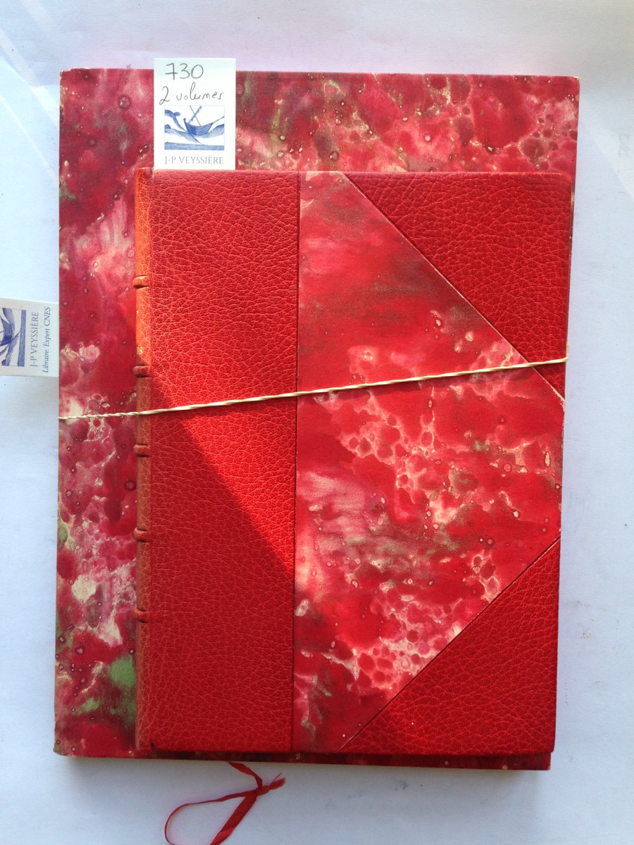 1 volume in-8 raisin à toutes barbes (255 X 188 mm), relié en 1/2 maroquin rouge à gros grains, tête dorée.et 1 volume in-folio en feuilles, sous chemise à dos de maroquin rouge et étui. Reliure moderne (2 petites taches au dos de la reliure).