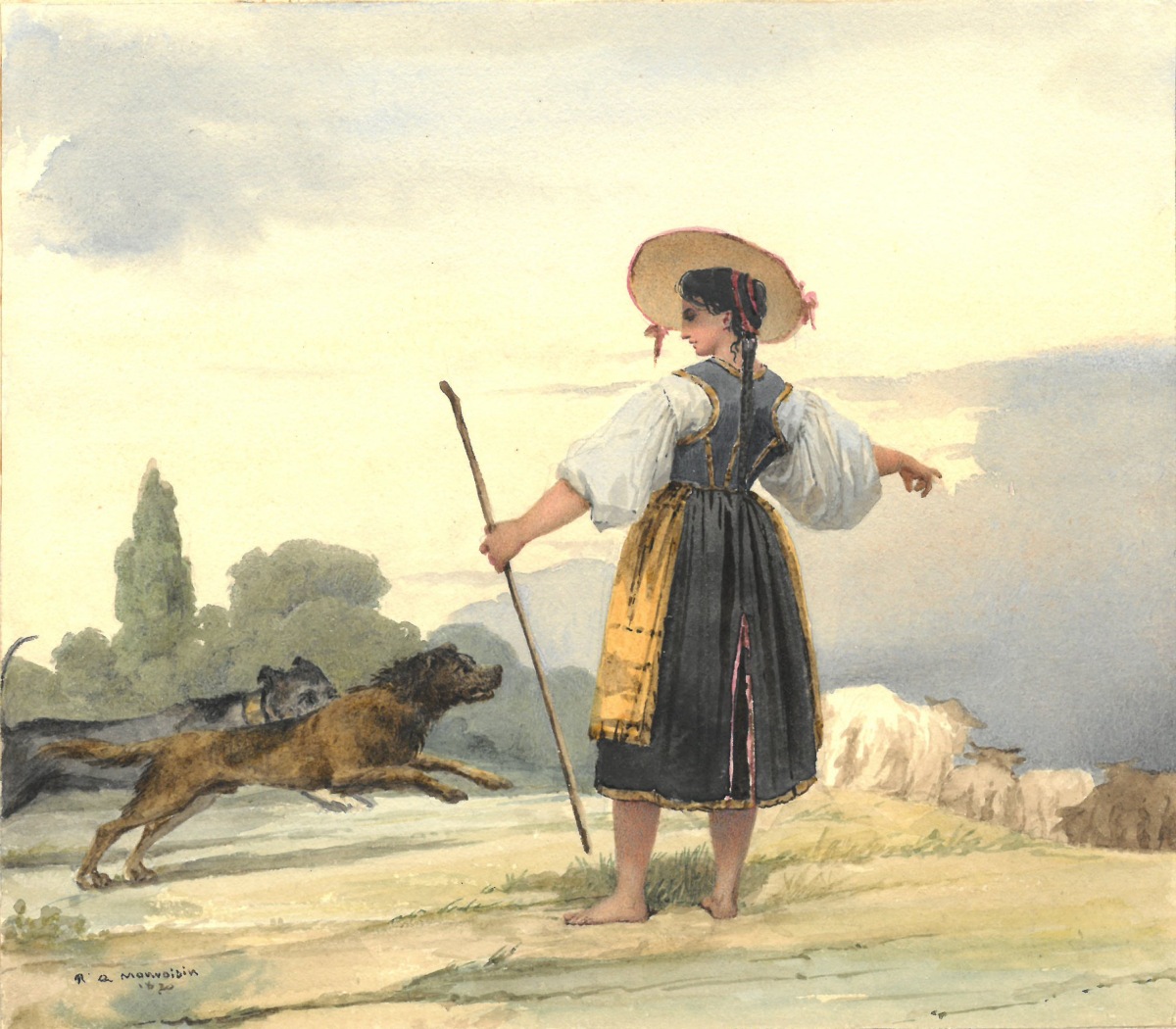Raymond Auguste  MONVOISIN (Bordeaux1790 - 1870)Bergère en pied.Aquarelle sur...