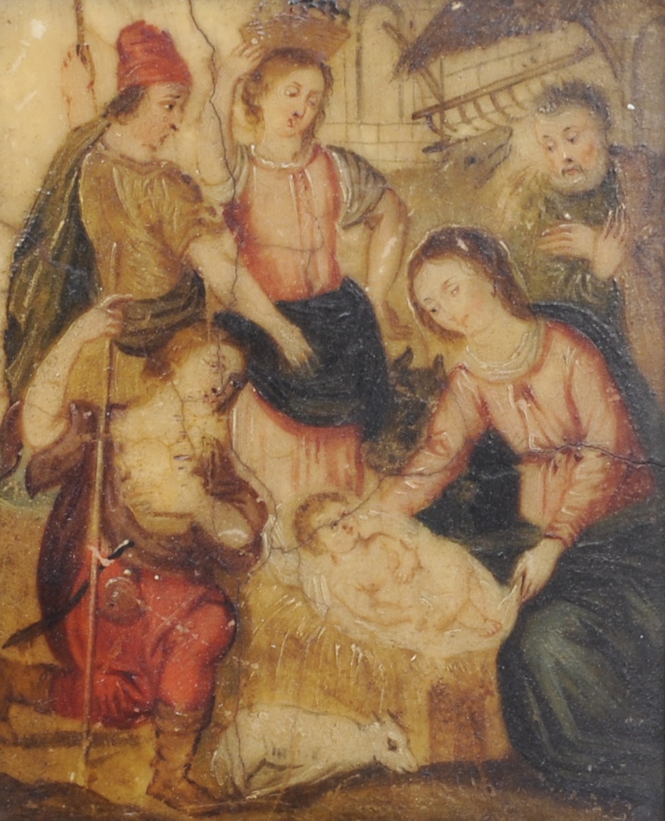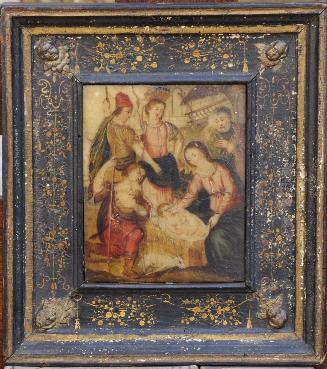 École FLAMANDE vers 1600.L'Adoration des Bergers.Albâtre.Haut. 12,2 Larg. 10 cm.Cadre...