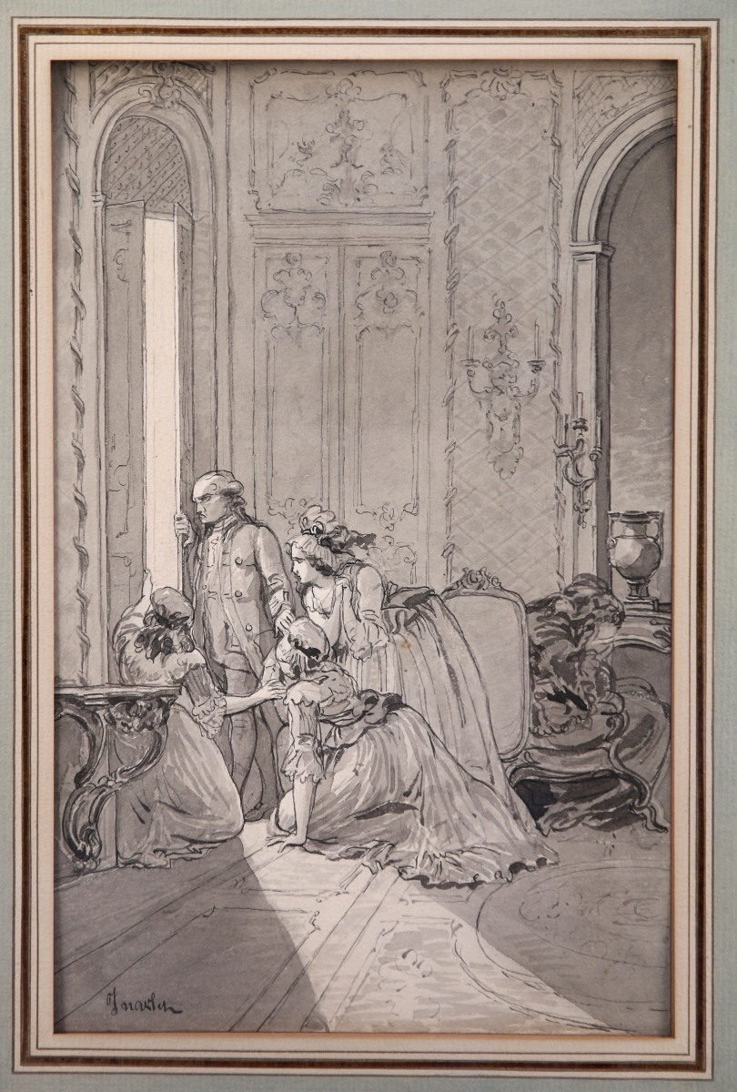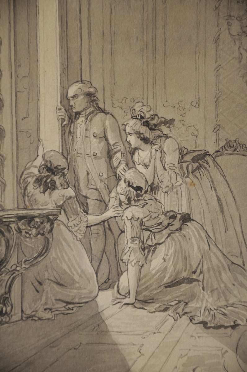 École FRANÇAISE du XIXe.Aristocrates guettant l'arrivée des révolutionnaires. Lavis signé...