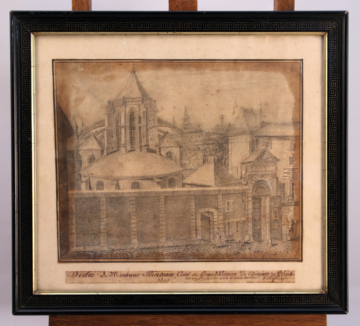 Crayon. Dédicace manuscrite à l'encre sur un bandeau : "Dédié A Monsieur Pointeau, Curé et Grand Vicaire de Diocèse de Blois. / Par son très humble et très obéissant Serviteur, Villegain f.n". / 1803".