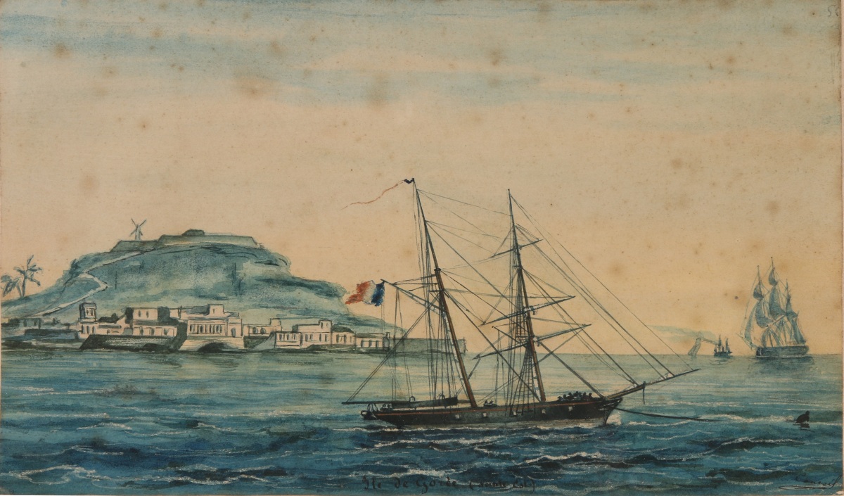 "Brigantin français devant "L' Île de Gorée (Pointe Est)".
