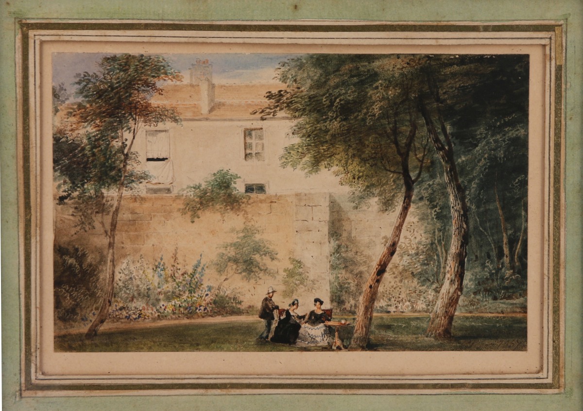 JOINT : École du XIXe. Conversation dans un parc. Aquarelle signée et datée en bas à droite. Haut. 10,5, Larg. 17 cm.