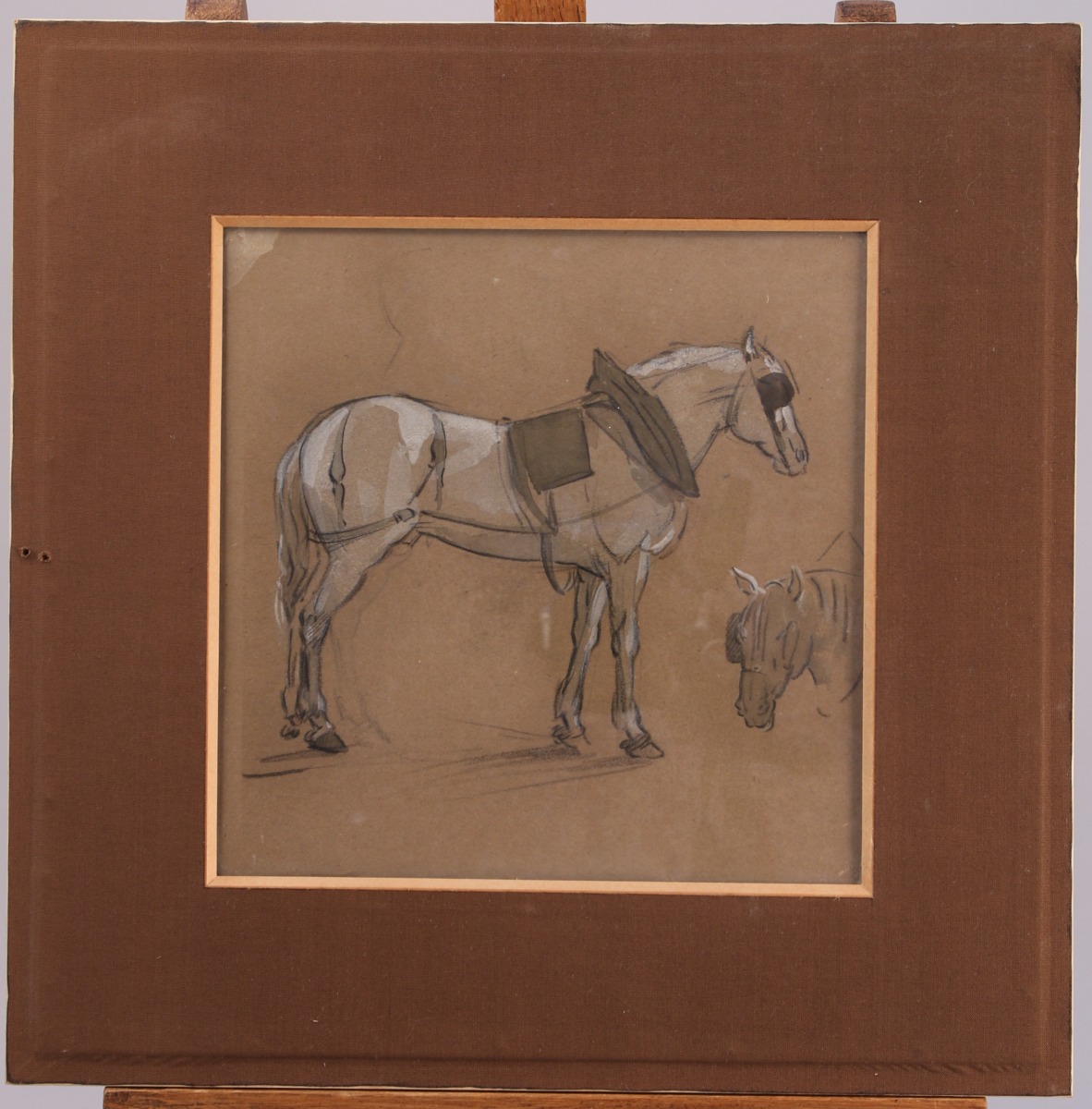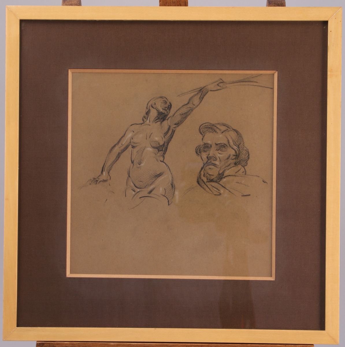 Pierre noire et rehauts de craie et de gouache blanche sur papier chamois.
