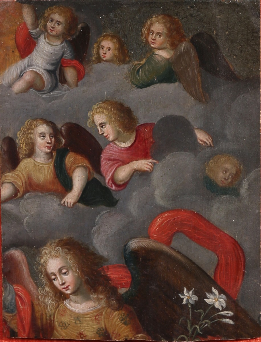 École FLAMANDE du XVIIe.Anges de l'Annonciation. Panneau (fragment). Haut. 27,...