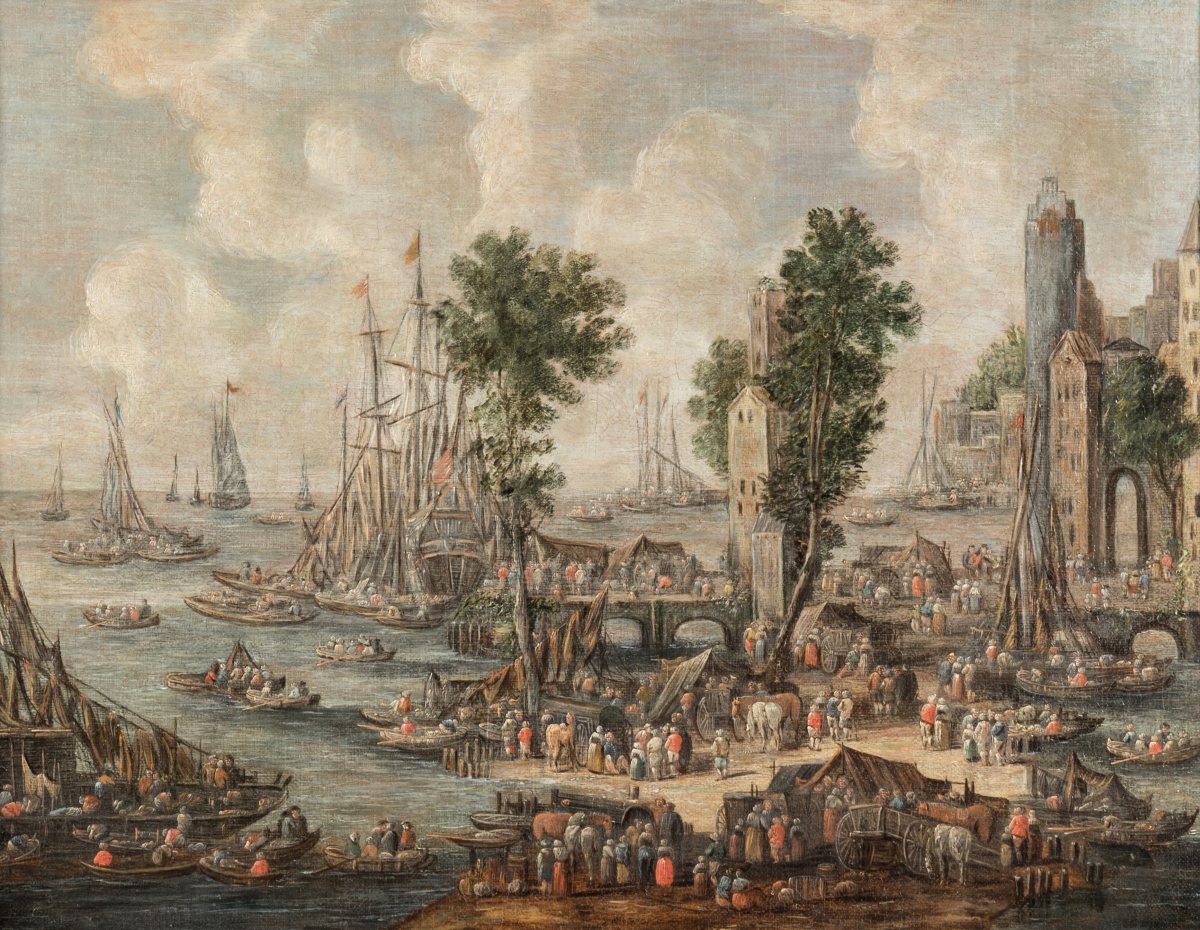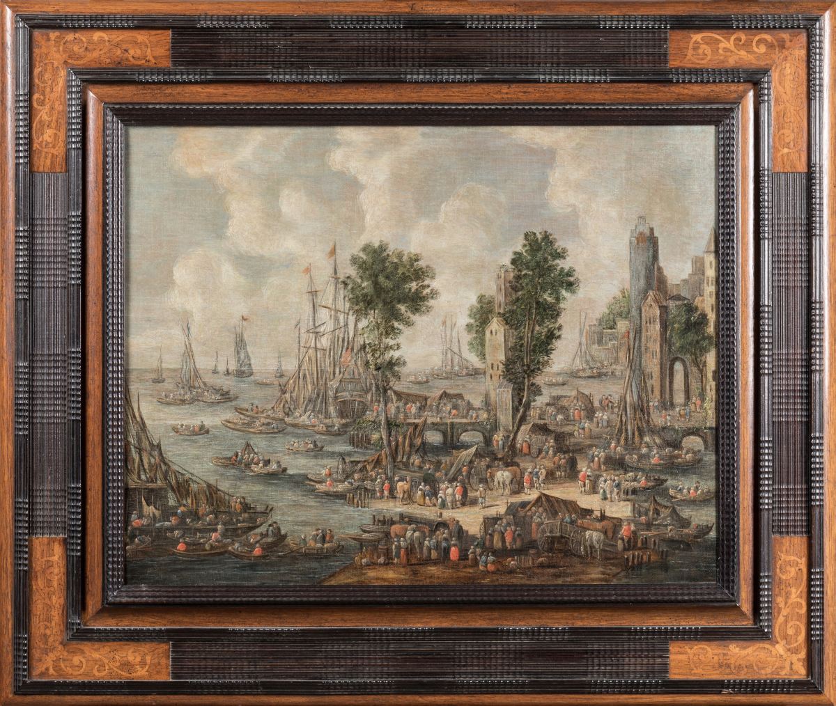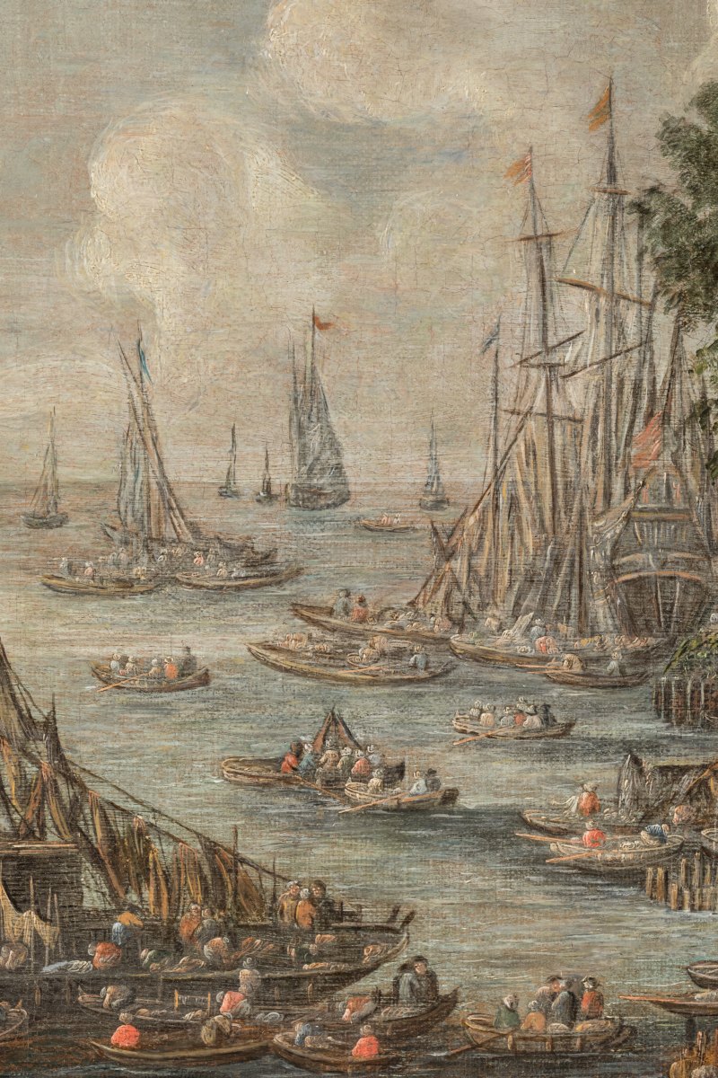 École FLAMANDE du XIXe, suiveur de Pierre CASTEELS.Scène portuaire.Toile.Haut. 53,...