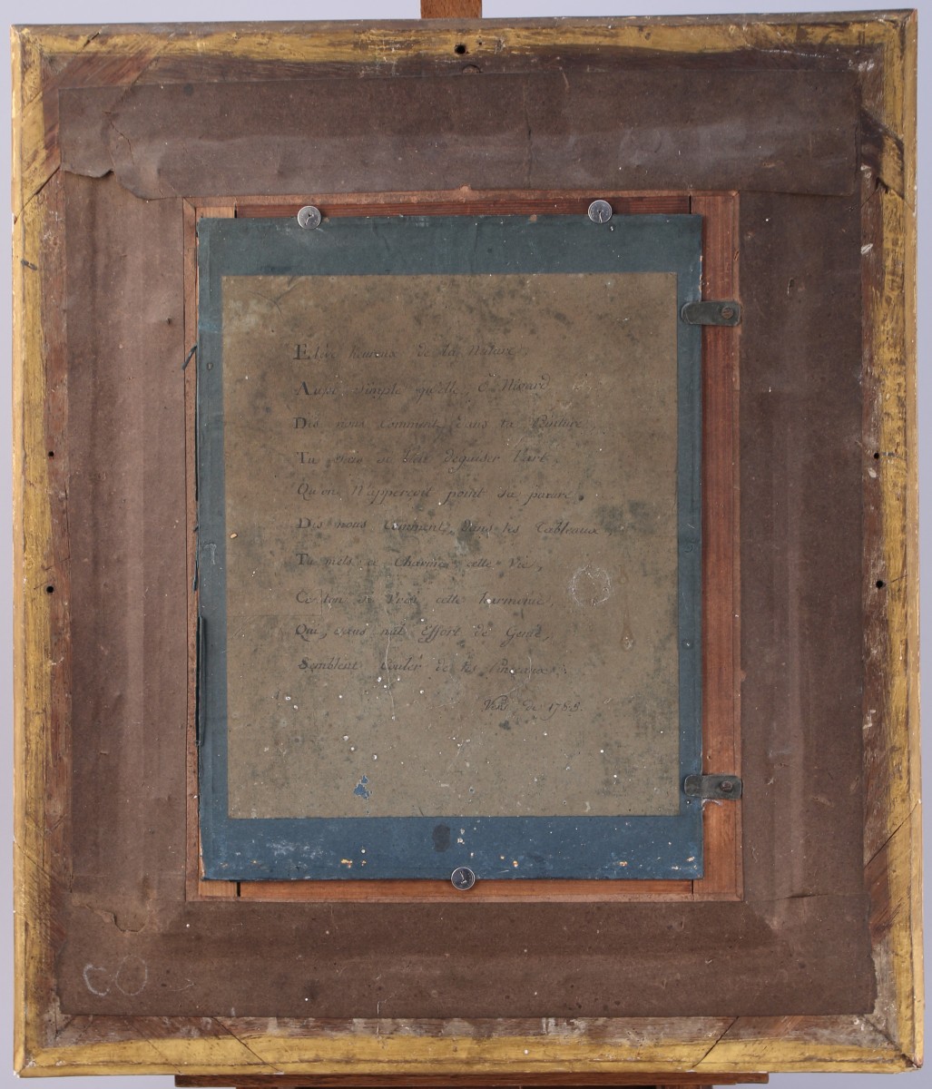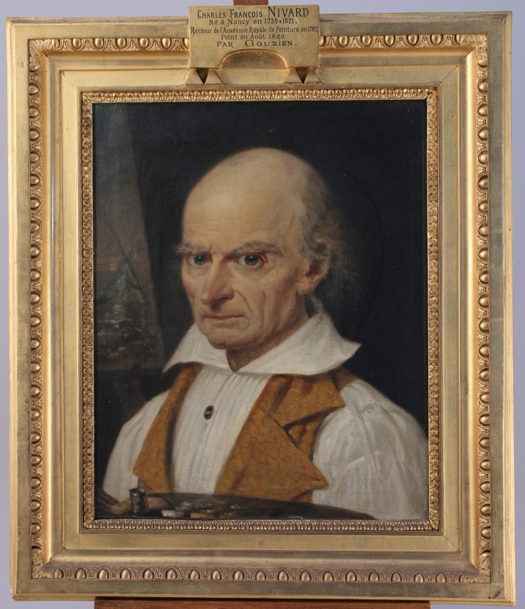 Un cartouche en partie supérieure du cadre indique : "Charles-François NIVARD / Né à Nancy en 1739 + 1821 / Recteur de l'Académie Royale de Peinture en 1782 / Peint en Août 1820 / par GOUZIEN".