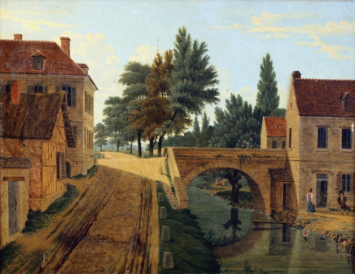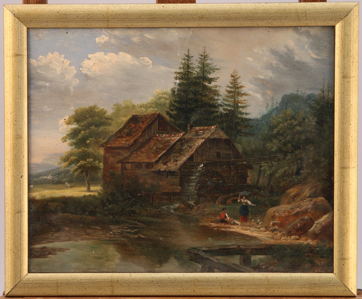 JOINT : Arthémise WARMÉ (1818-1899) Vue animée d'un moulin à eau. Toile. Haut. 21, Larg. 27 cm.