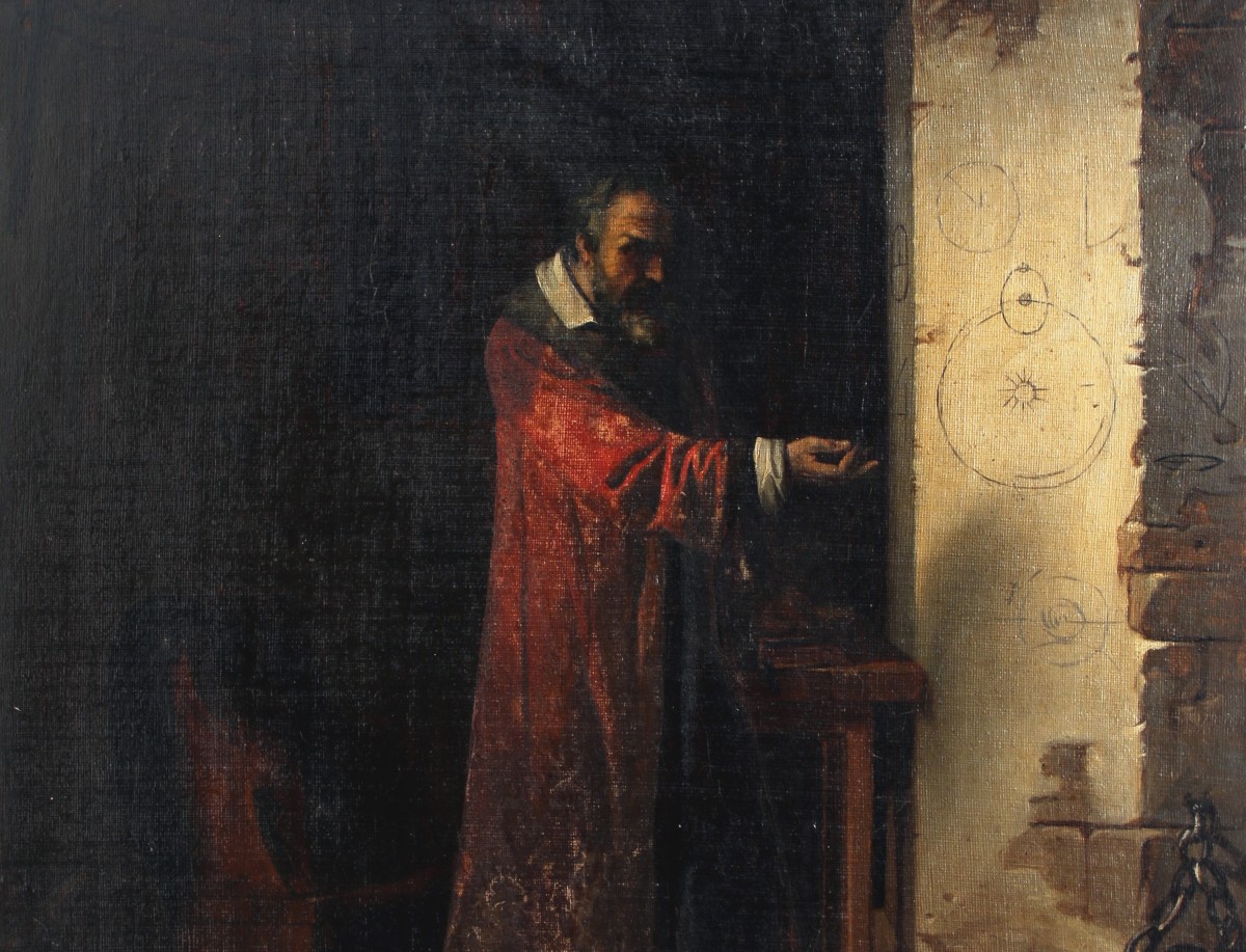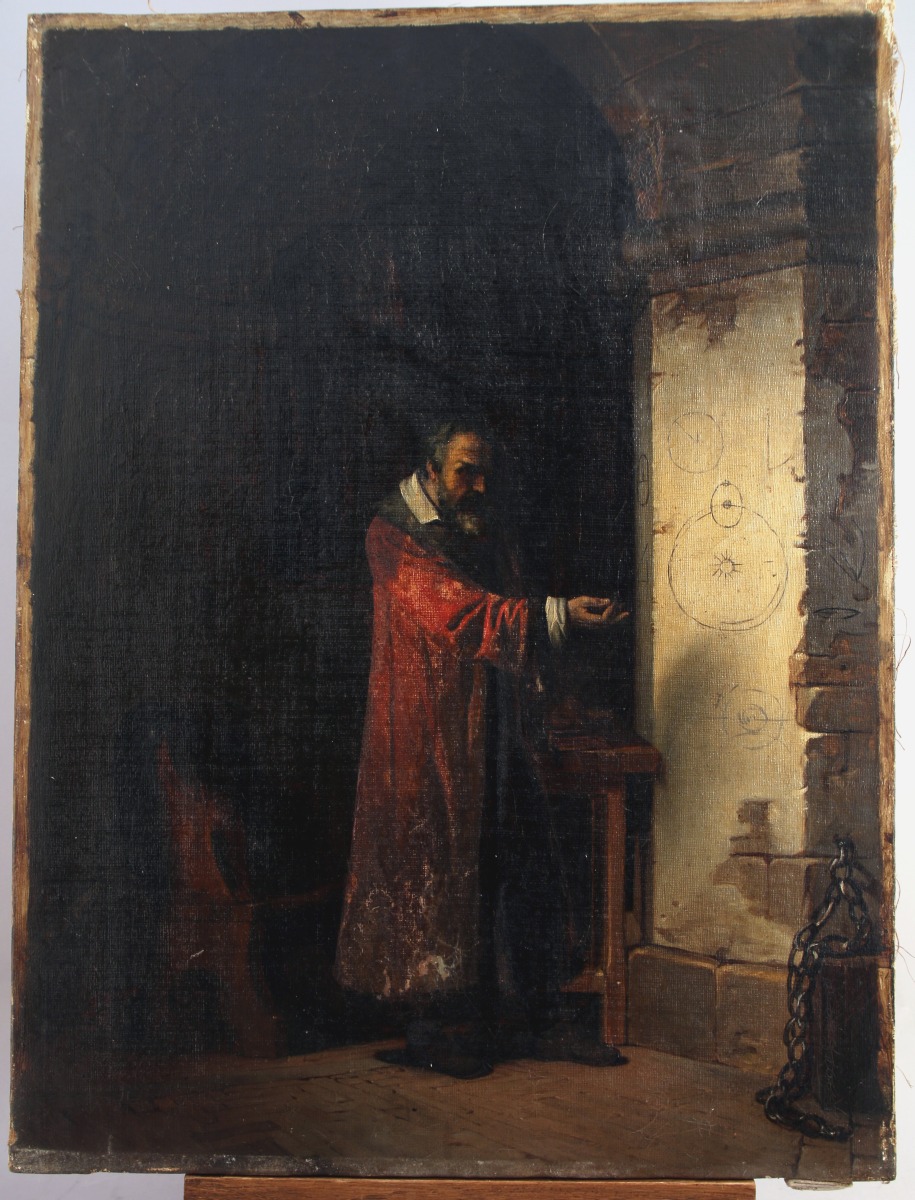 Notre tableau reprend l'oeuvre de 1820 par Jean Antoine Laurent le Vieux (1763-1832) conservée au Musée des Beaux Arts de Dole et connue par une gravure de Antoine-Joseph Chollet en 1825. L'astronome est présenté en pied dans sa cellule, traçant au charbon des schémas sur les murs.