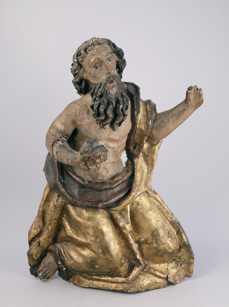 en résineux sculpté, stuqué, doré et peint. Il est représenté à genoux, tenant une pierre - symbole de son martyr - de la main droite et levant la main gauche vers le ciel.