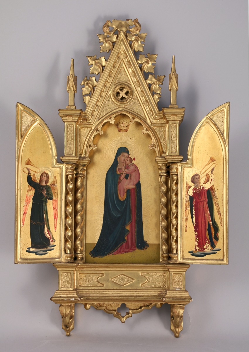 en bois scpulté, stuqué et doré. Le panneau central figure, sur fond or, la Vierge à l'Enfant inscrite dans une baie flanquée de colonnes torses. Il est sommé d'un gâble orné de feuillages stylisés et de pinacles. Les panneaux latéraux, eux-mêmes sur fond or, figurent dans anges à la trompette. Étiquette à l'arrière : "Angiolo Valdinoci / Fabricant / des meubles et cadres / en bois noyer et doré / collection de tableaux / gallery of fine arts / atelier rue du Moro 4 / Florence / via dei Fossi n°3".