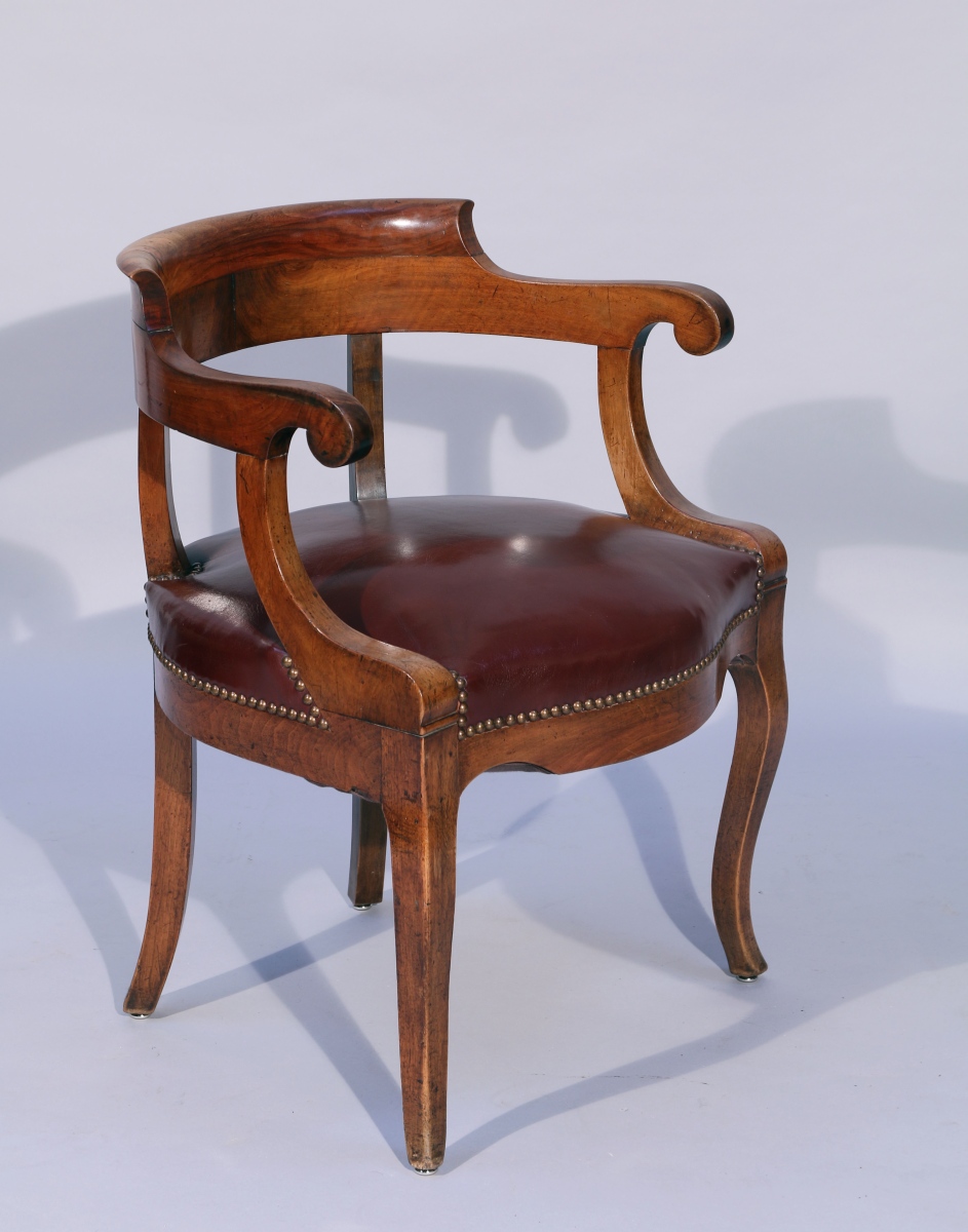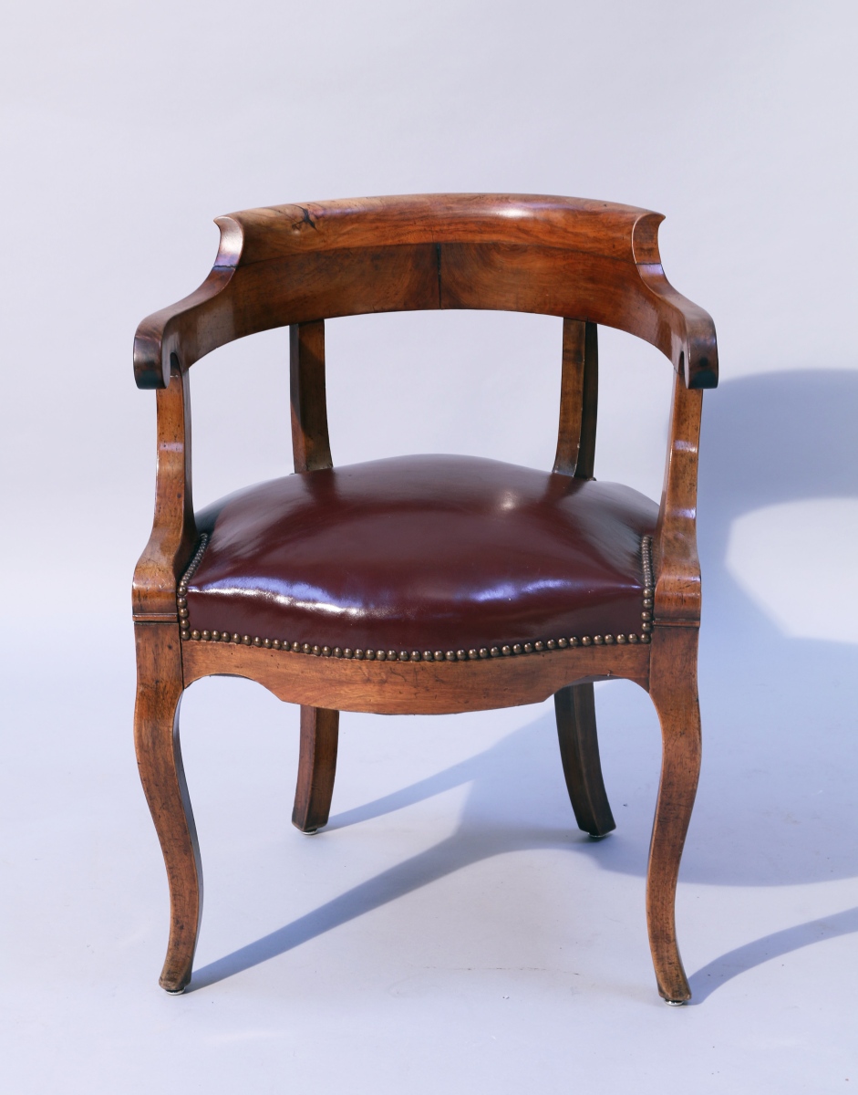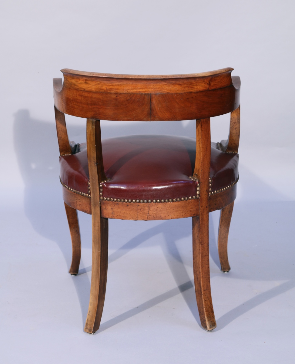 dossier enveloppant en noyer. Accotoirs crosse. Il repose sur quatre pieds, les antérieurs cambrés, les postérieurs sabres. Restauration, deuxième quart du XIXe.