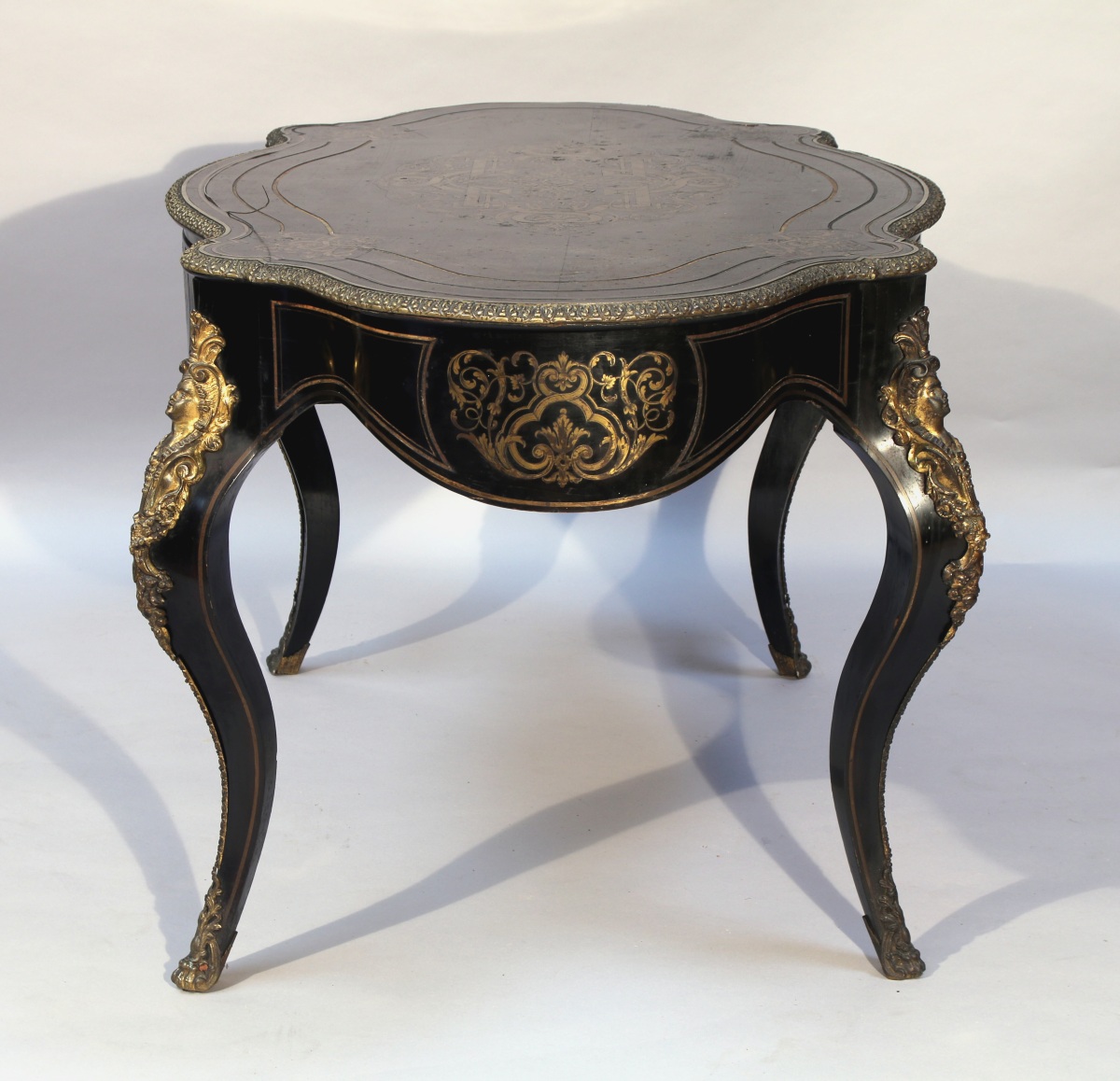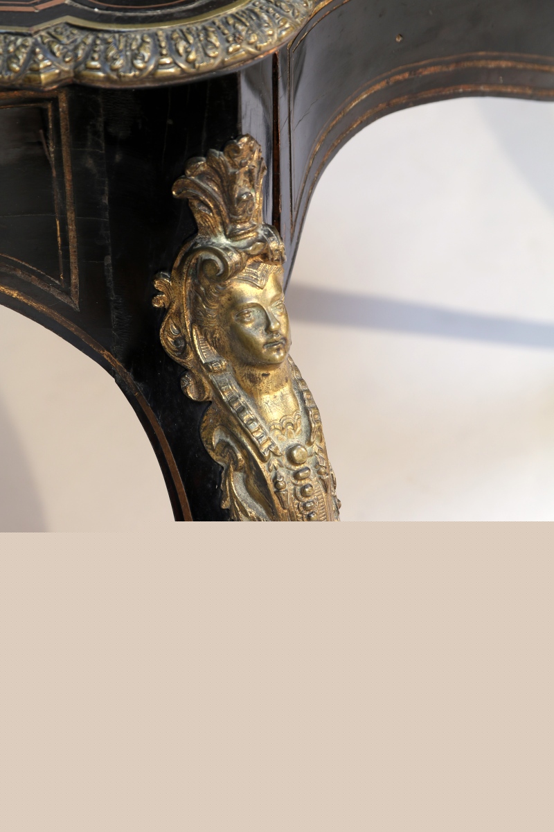en placage de bois noirci ouvrant par un tiroir en ceinture. Riche décor de fleurons, feronneries, rinceaux feuillagés et filets en marqueterie de laiton, tant sur le plateau que sur les traverses chantournées. Le plateau est ceint d'une lingotière à frise d'oves et de feuillages. Elle repose sur quatre pieds cambrés agrémentés de bronzes tels qu'une espagnolette en partie supérieure et de sabots.