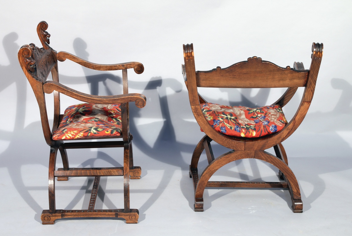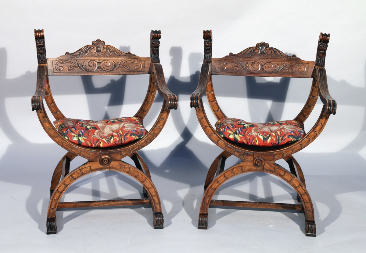 PAIRE de FAUTEUILS curules en bois naturel à dossier bandeau. Les montants du dossier terminés par une tête de lion. Décor sculpté de rinceaux feuillagés et d'acanthes. Ils reposent sur des pieds patins réunis par une entretoise en "H".