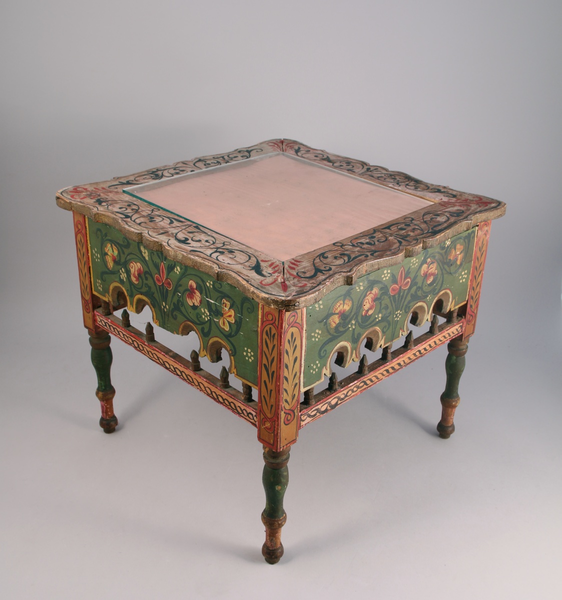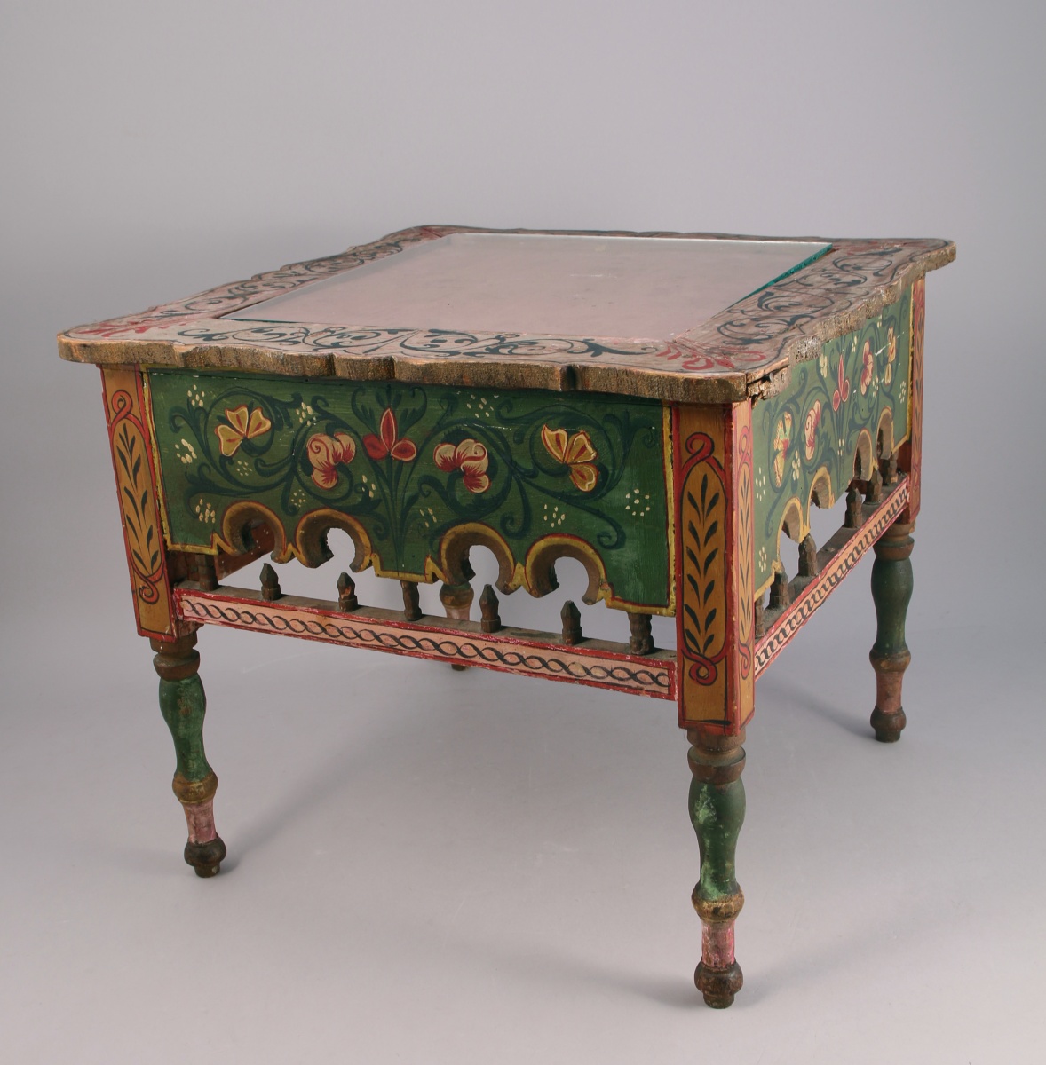 TURQUIE. Petite TABLE BASSE de forme rectangulaire en bois peint de fleurs polychrome sur un fond vert, reposant sur quate pieds ballustres.