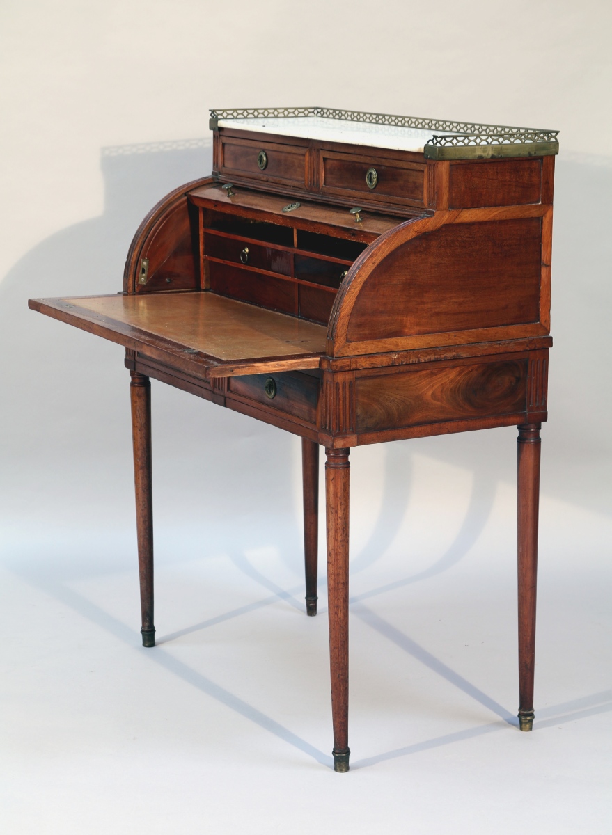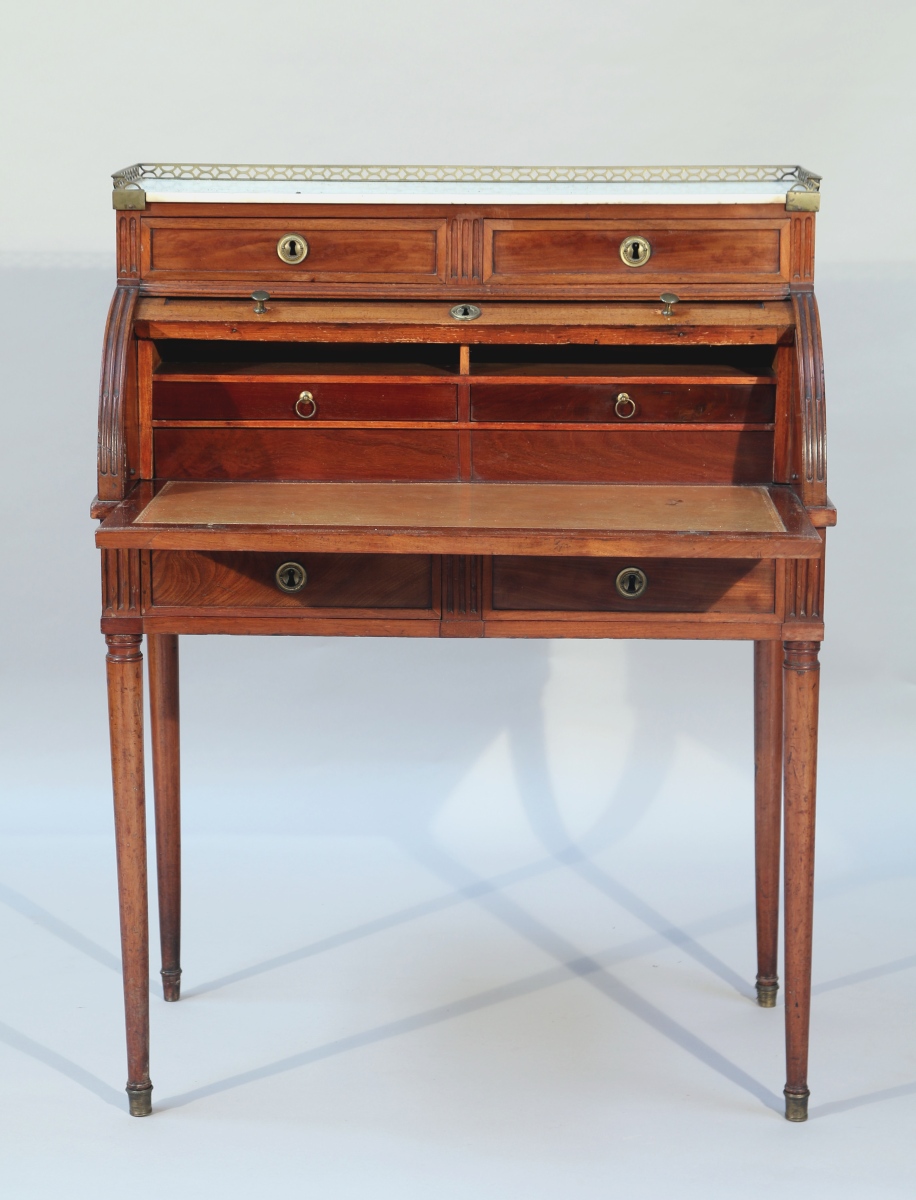 et placage de noyer ouvrant en façade par deux tiroir en ceinture, deux tiroirs dans le gradin et un abatant découvrant un intérieur à deux tiroirs, caissons et tablette coulissante. Garniture de bronzes tels que entrées de serrure, boutons de tirage et sabots. Il repose sur quatre pieds fuselés. Dessus de marbre blanc ceint d'une galerie de laiton ajourée.