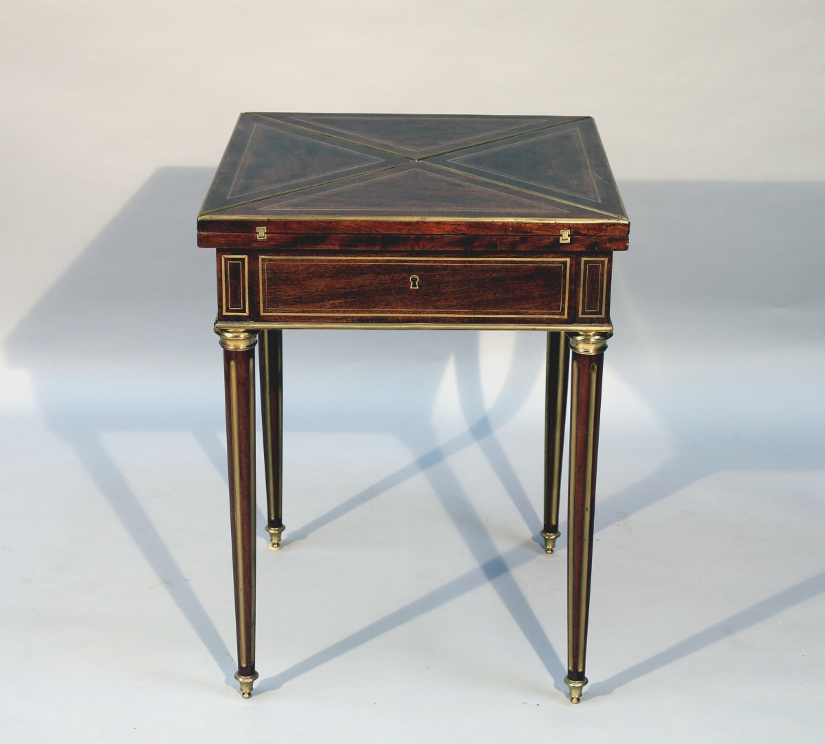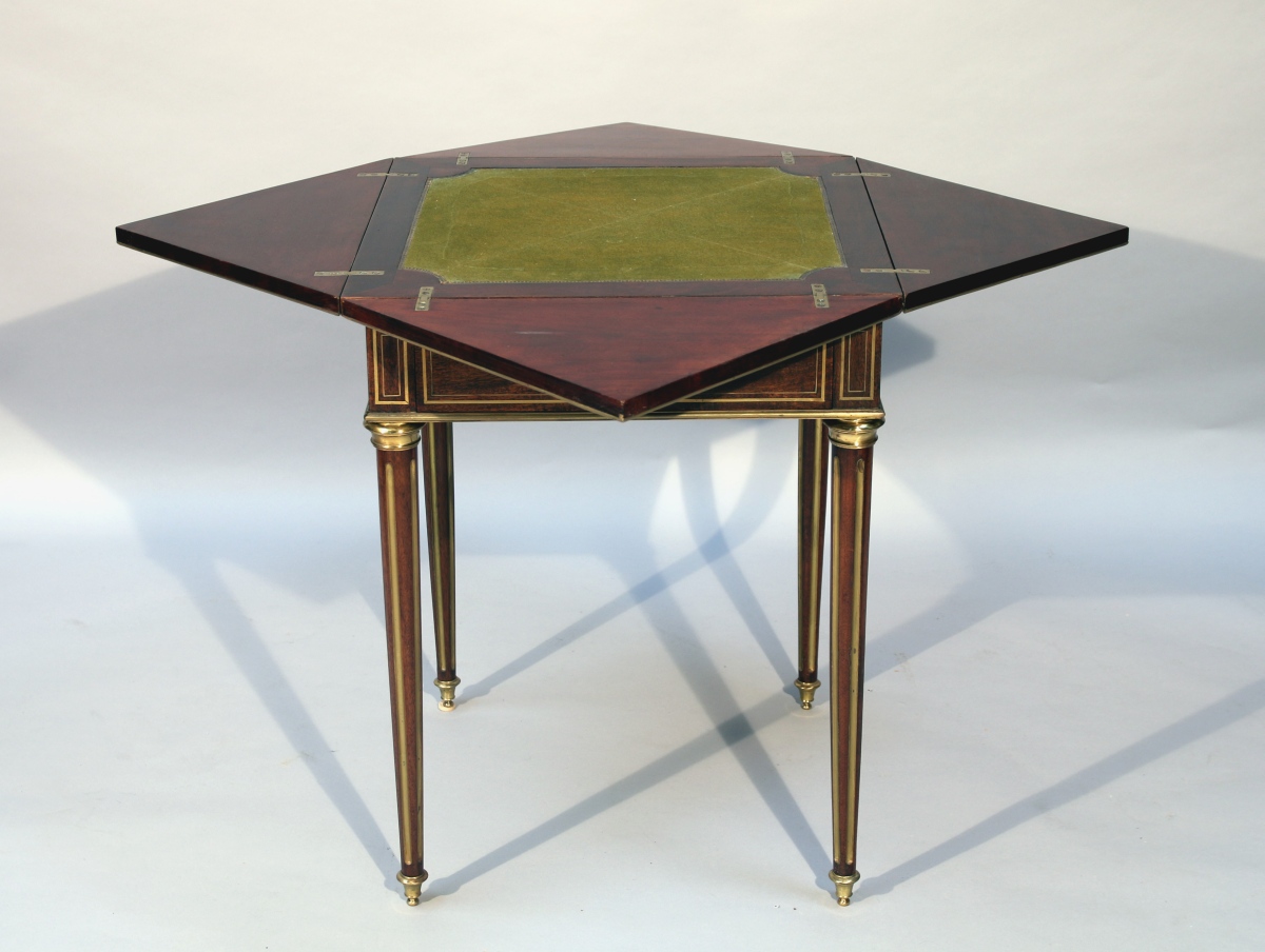 en placage de bois teinté à la façon de l'acajou à encadrements en filets de laiton. Elle ouvre par un tiroir en ceinture et repose sur quatre pieds fuselés bagués de bronze à cannelures garnies de laiton.