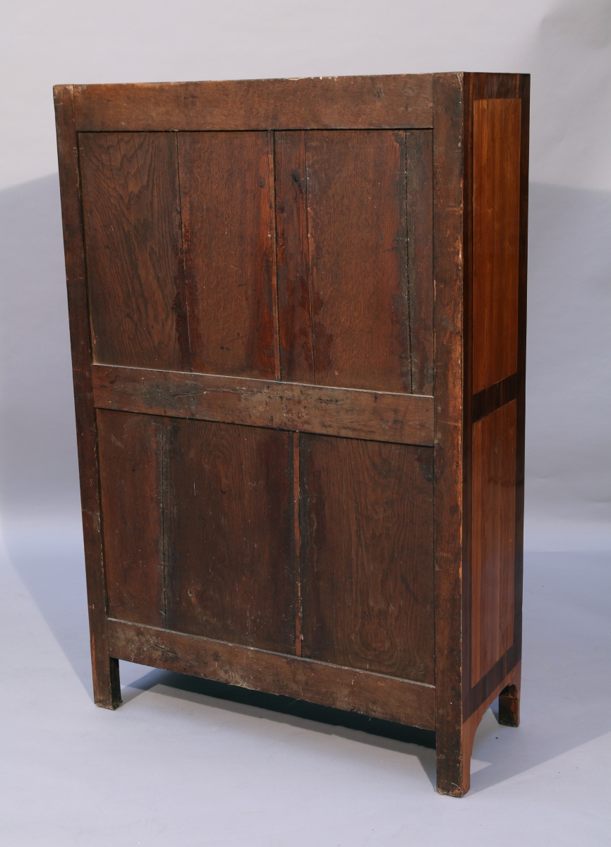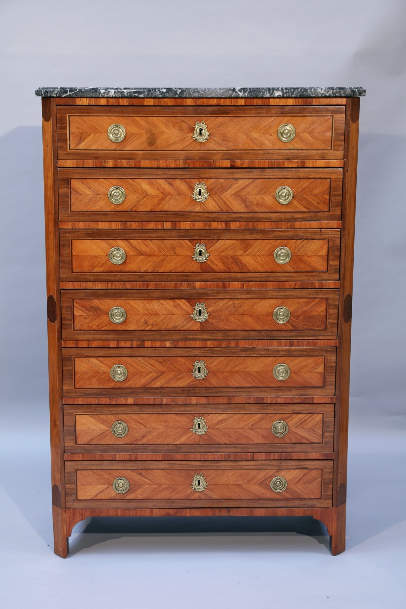 de forme rectangulaire en placage de bois de rose et d'amarante avec des encadrements en filets de bois teinté. Il ouvre à sept tiroirs en façade et ses montants sont à pans coupés. Il est garni d'anneaux de tirage et d'entrées de serrure en bronze doré. Estampillé "F. Reizell" et "G. Kintz" sur le plateau.