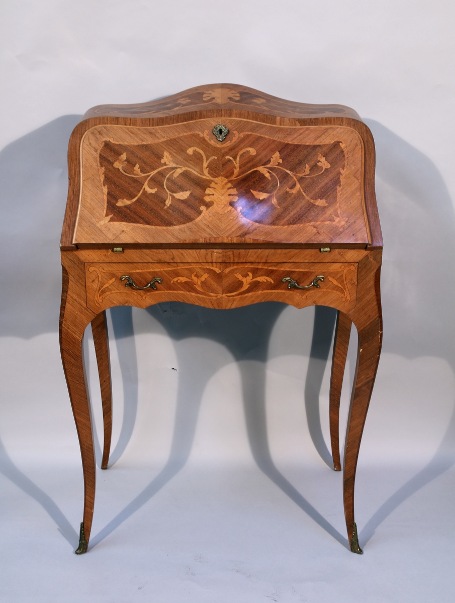 en bois de placage toutes faces. Marqueterie à décor de branchages stylisés en façade et sur les côtés. Il ouvre à un large tiroir dans la partie inférieure, et un abattant brisé dévoilant 4 petits tiroirs. Style Louis XV.