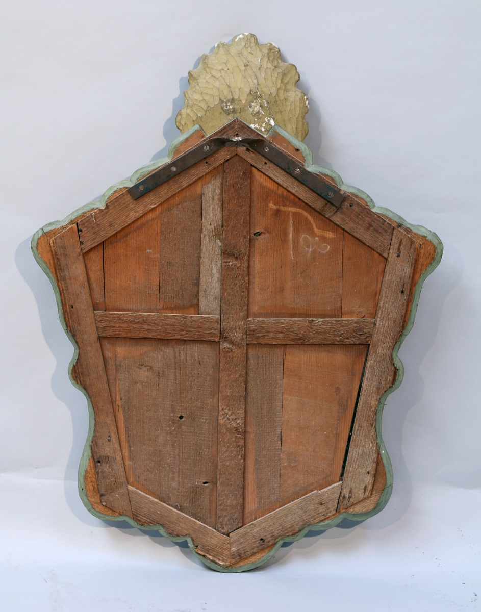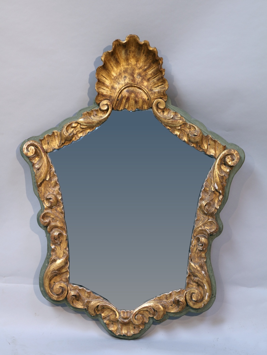 en bois sculpté, stuqué, doré sur fond laqué vert présentant une large coquille à l'amortissement. Ornementation d'enroulements feuillagés et motifs rocaille. Fond parqueté.