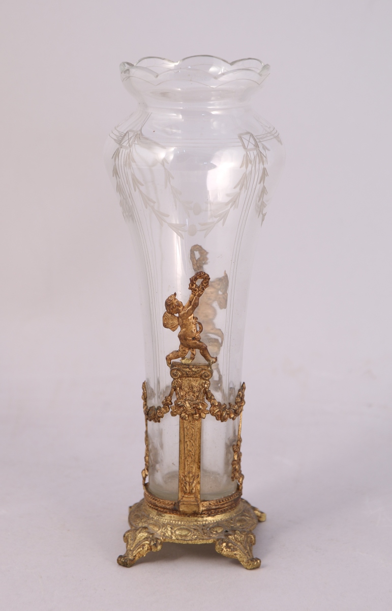en VERRE gravé à la roue de filet et guirlandes de lauriers. Bordure polylobées. Monture en métal doré à décor d'amours juchés sur des colonnes ioniques reliées par des guirlandes de fleurs rubanées. Piètement quadripode.