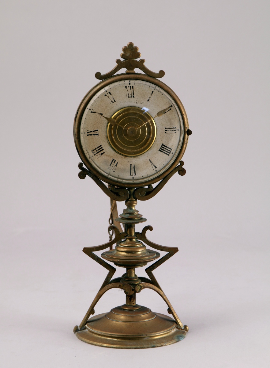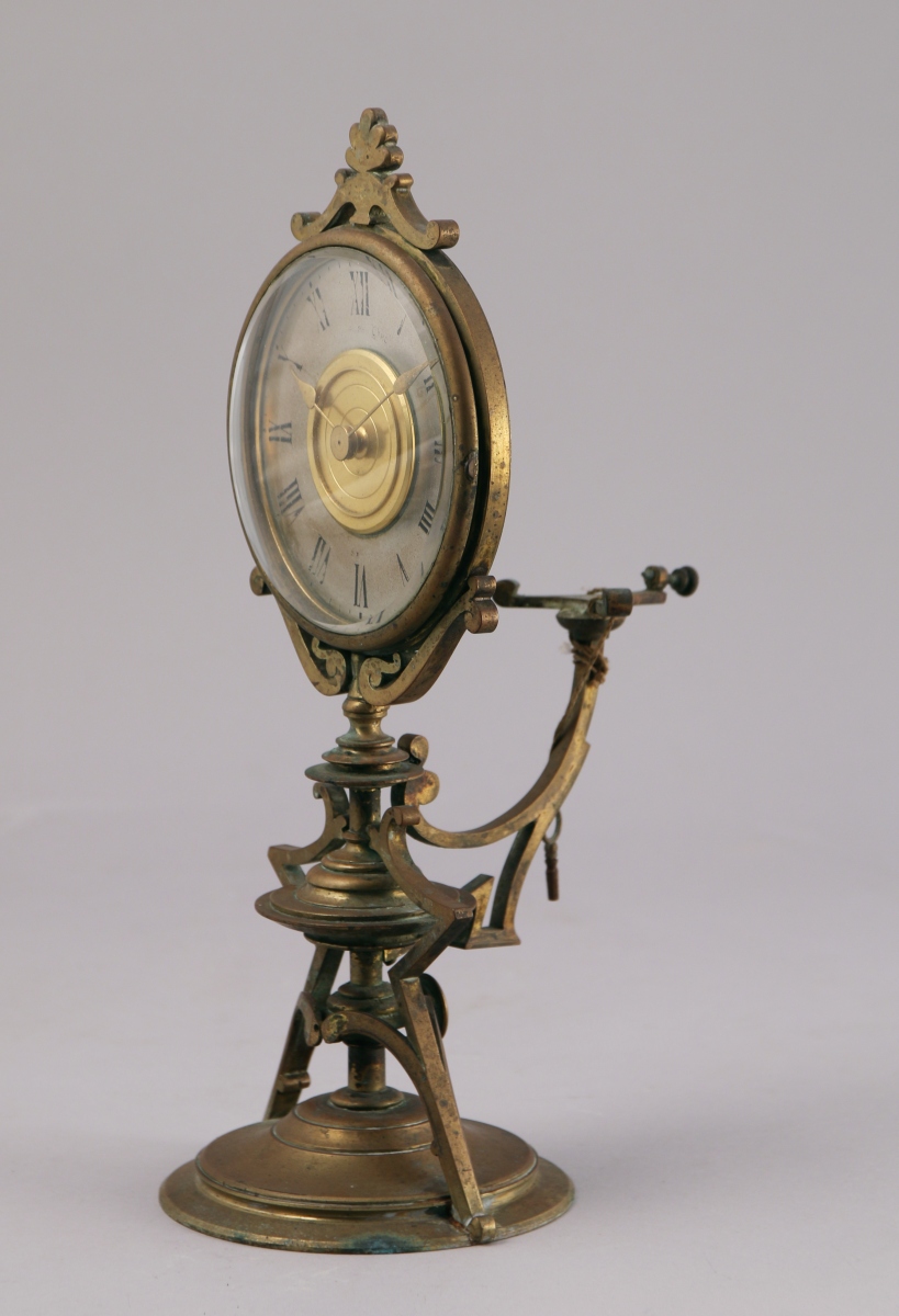 Cadran de forme ronde en verre dépoli indiquant les heures en chiffres romains (trace de signature). Il est centré d'un disque doré correspondant au mouvement. Encadrement sommé d'une palmette et souligné d'enroulements feuillagés. Piètement constitué d'un fût central à disques flanqué d'éléments coudés reposant sur une base circulaire. Un bras muni d'une plateforme destinée à accueillir une source lumineuse à l'arrière.