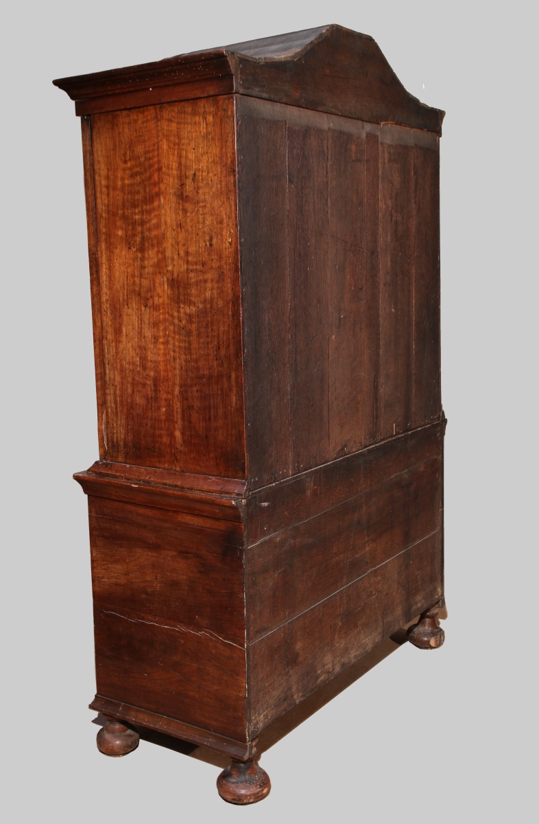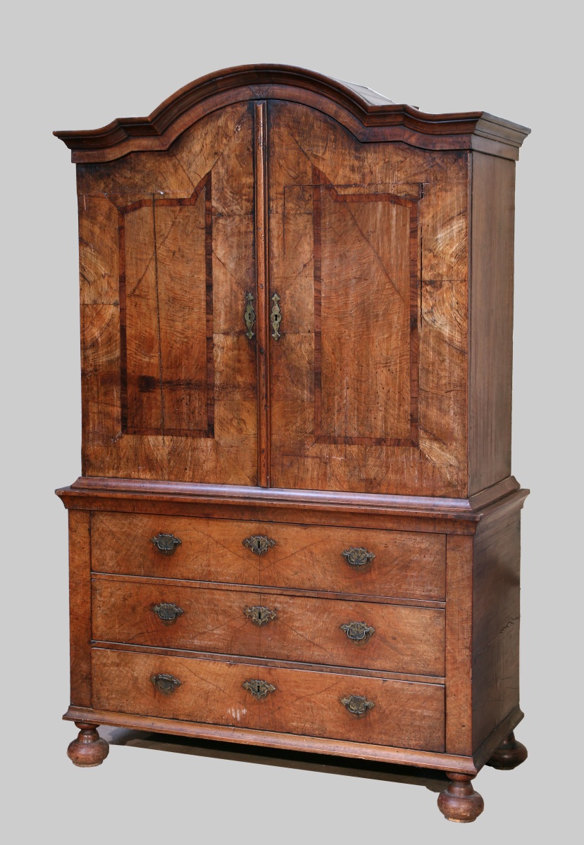 COMMODE EN ARMOIRE transformé en penderie à chapeau de gendarme en placage de noyer flammé et ronce de noyer. La partie haute ouvre à deux vantaux et la partie basse à un tiroir, les deux premiers étant simulés. Mains tombantes et entrées de serrure en laiton découpé et ciselé rapportées. Piètement en boule aplatie quadripode.