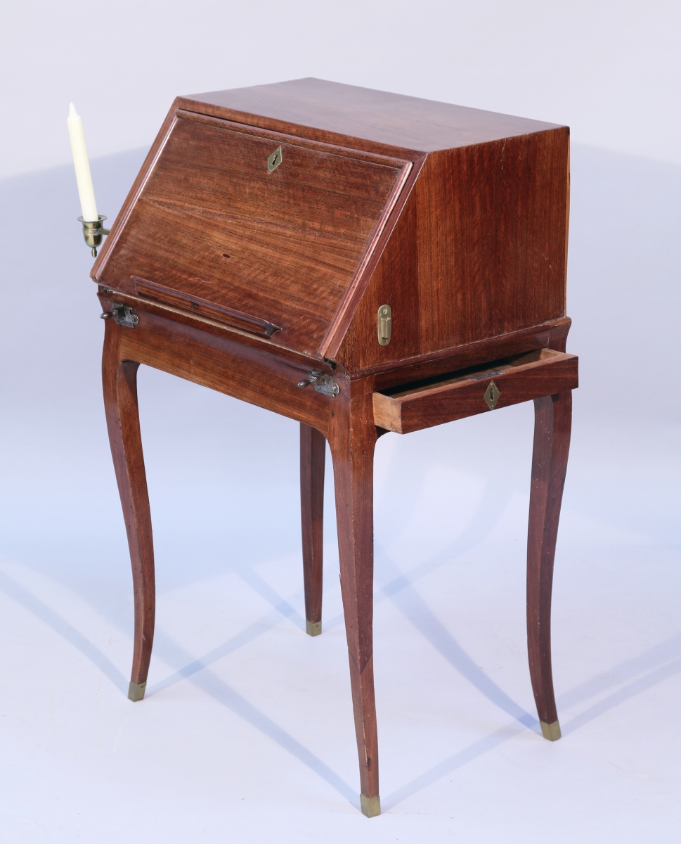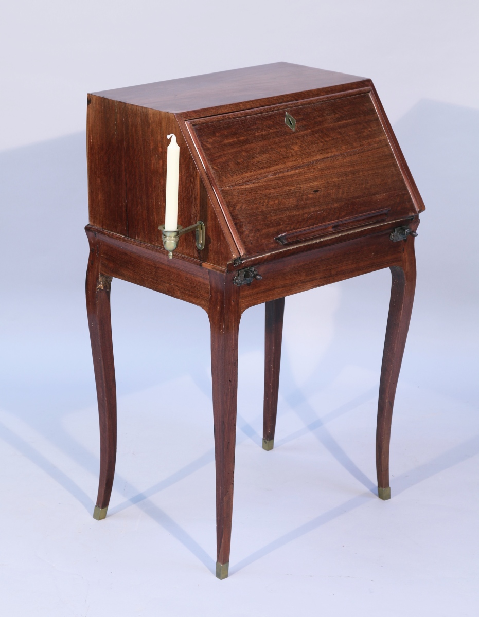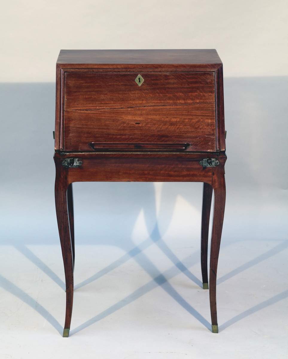 ouvrant par un abattant formant lutrin sur sa face extérieure. Ouvert, il découvre six tiroirs et un pupitre gainé de maroquin vert, équipé d'un porte-chandelle. Il repose sur quatre pieds galbés.