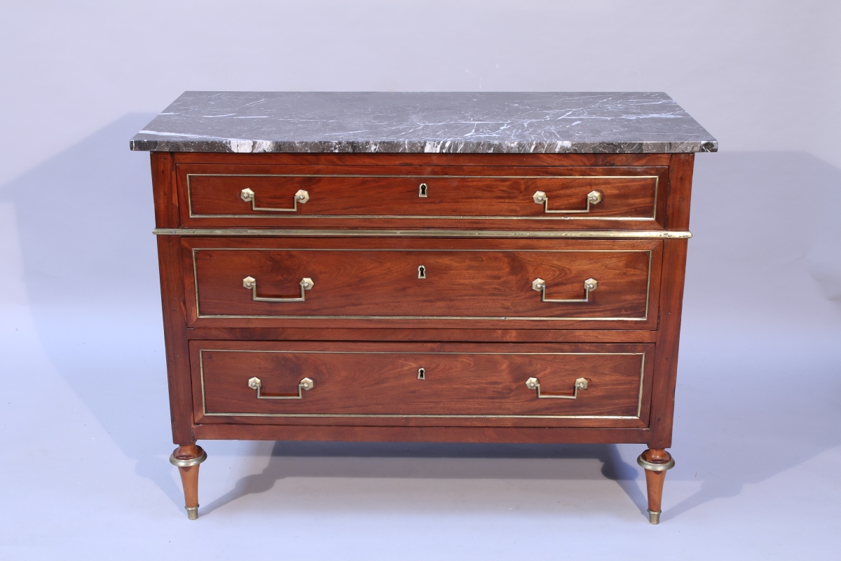 de forme rectangulaire. Elle ouvre en façade par trois tiroirs. Montants cannelés, les antérieurs arrondis, les postérieurs à léger décrochement. Elle repose sur quatre pieds toupie. Garnitures en laiton telles que poignées mobiles, entrées de serrure, baguettes et grattoirs.