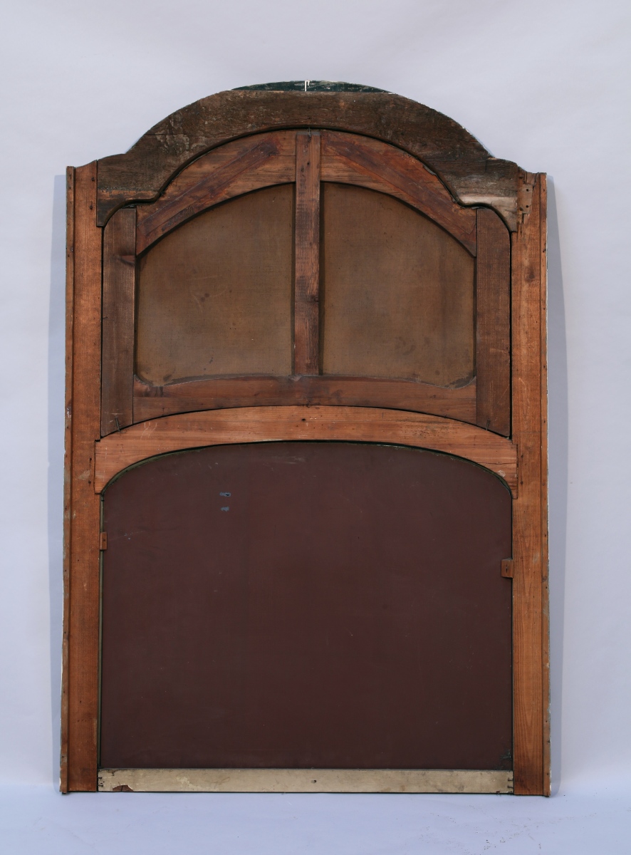 et laqué orné d'un miroir en partie basse et d'une toile figurant trois femmes à la source en partie haute. Peinture dans le goût des pastorales du XVIIIe: trois femmes en chemise dans la nature avec une fontaine à tête de dauphin d'où jaillit la source.
