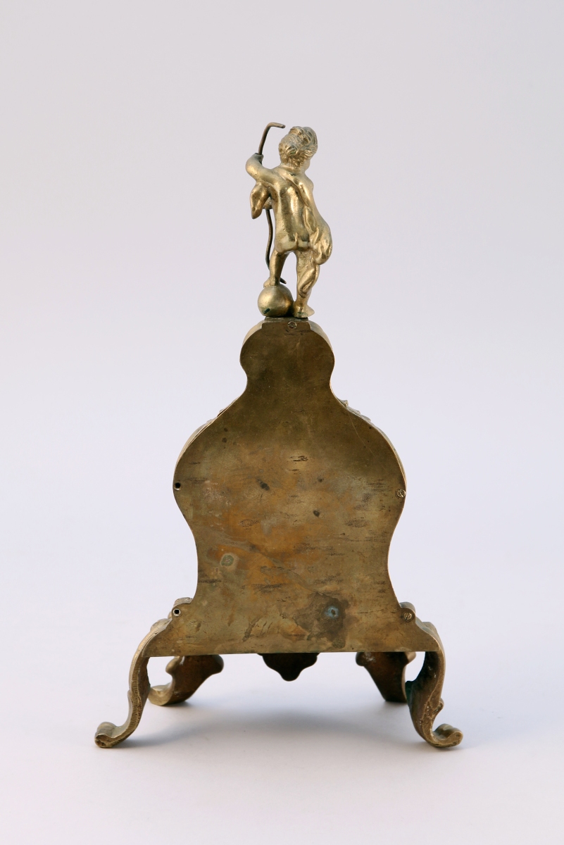 en bronze dans le gout de l'Horloge Astronomique livrée pour le roi Louis XV par Passement, dans une caisse de forme mouvementée surmontée d'un amour archer. Il repose sur quatre pieds feuillagés terminés par des enroulements. Cadran émaillé gradué pour les minutes, avec les heures en chiffres romains et gradués en chiffres arabes pour chaque période de 5 minutes (Diam. 54 mm).