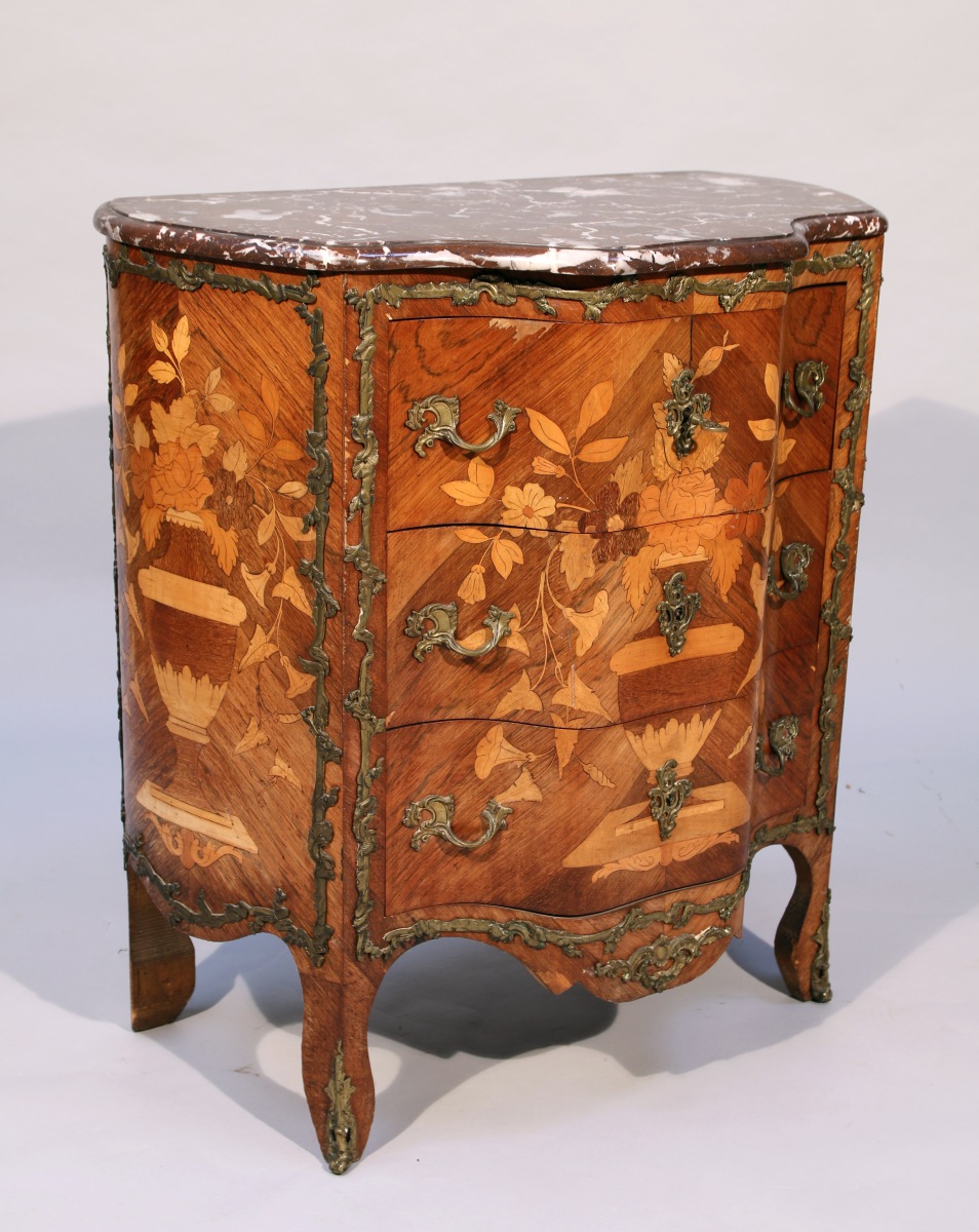 de forme mouvementée ouvrant en façade par trois tiroirs. Elle reçoit un riche décor marqueté de vases fleuris en façade et sur les côtés. Garniture de bronzes ciselés tels que entrées de serrure, poignées de tirage, frises feuillagées, sabots et tablier. Traverse basse chantournée à cul-de-lampe. Dessus de marbre griotte rouge de Belgique. Piètement quadripode.