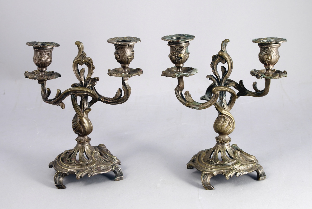 PAIRE de BOUTS-DE-TABLE à deux lumières en bronze ciselé. Deux bras sinueux s'enroulent autour du fût central ajouré. Riche décor rocaille tel que coquille, acanthes, enroulements et agrafes feuillagées. Piètement quadripode.