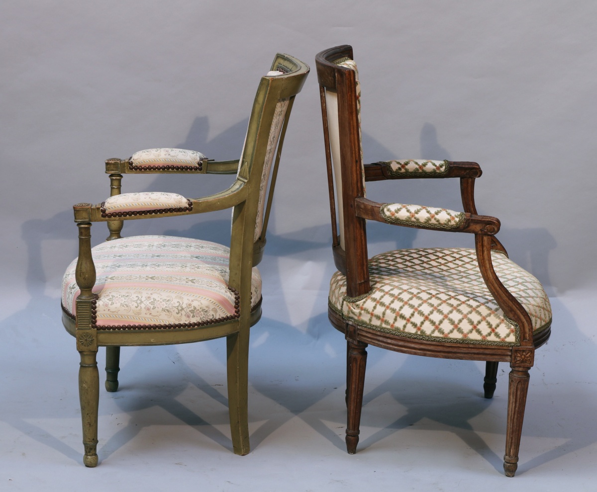 en bois mouluré et sculpté laqué vert. Le dossier trapézoïdal, les accotoirs à manchettes aux montants balustres, dés de raccordements fleuronnés. Piètement antérieur balustre, les pieds postérieurs droits.