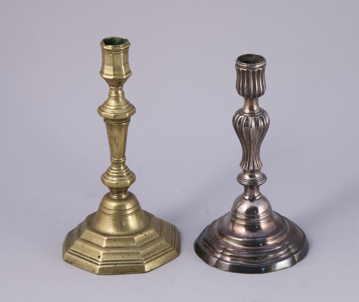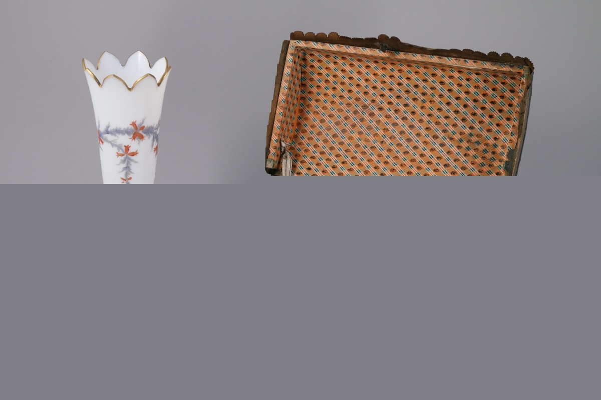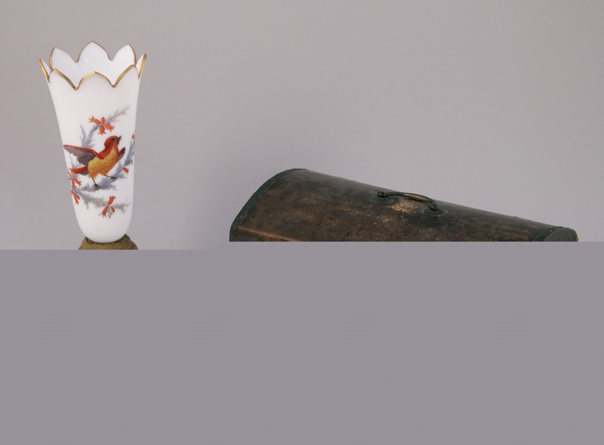 7 PIÈCES : DEUX FLAMBEAUX, l'un en métal argenté, l'autre en laiton; ÉCRITOIRE en placage d'acajou (Haut. 8, Larg. 42,5, Prof. 31,5 cm); BOÎTE À COURRIER gainée de cuir à motifs estampés et son contenu de lettres et enveloppes oblitérées, majoritairement des années 1860 (Haut. 15, Larg. 24,5, Prof. 12 cm); COFFRET en placage d'acajou (Haut. 11, Larg. 32,5, Prof. 21,5 cm); COFFRET gainé de cuir à couvercle bombé (Haut. 16, Larg. 29,5, Prof. 17 cm); VASE cornet en opaline savonneuse à décor émaillé polychrome d'un oiseau branché, socle recouvert de velours vert (Haut. opaline : 18,5 cm).
