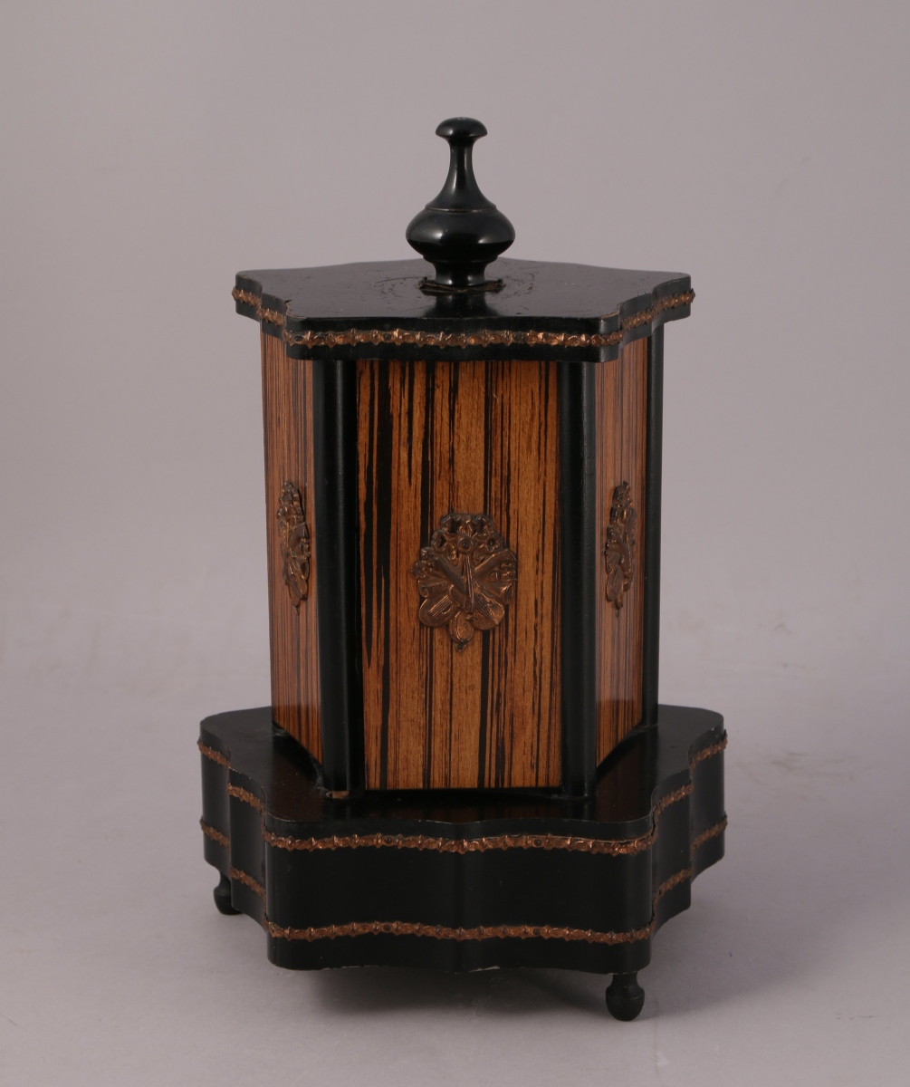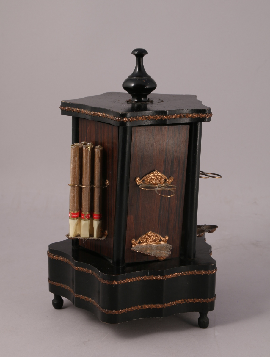 en bois noirci. Les portes à l'imitation de l'ébène de macassar sont agrémentée d'une applique en pomponne figurant un trophée musical à l'extérieur et d'un réceptacle pour trois cigares ou six cigarillos à l'intérieur. Base chantournée recélant le mécanisme musical comportant deux airs : "Le grand Mogol" et "Les 8 jours". Une toupie à l'amortissement permet l'ouverture des portes.