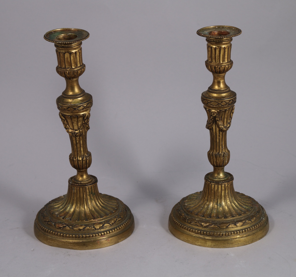 et ciselé, le fût cannelé à guirlandes soutenant le binet en forme de vase Médicis. La base circulaire à décor de cannelures, lauriers et godrons.