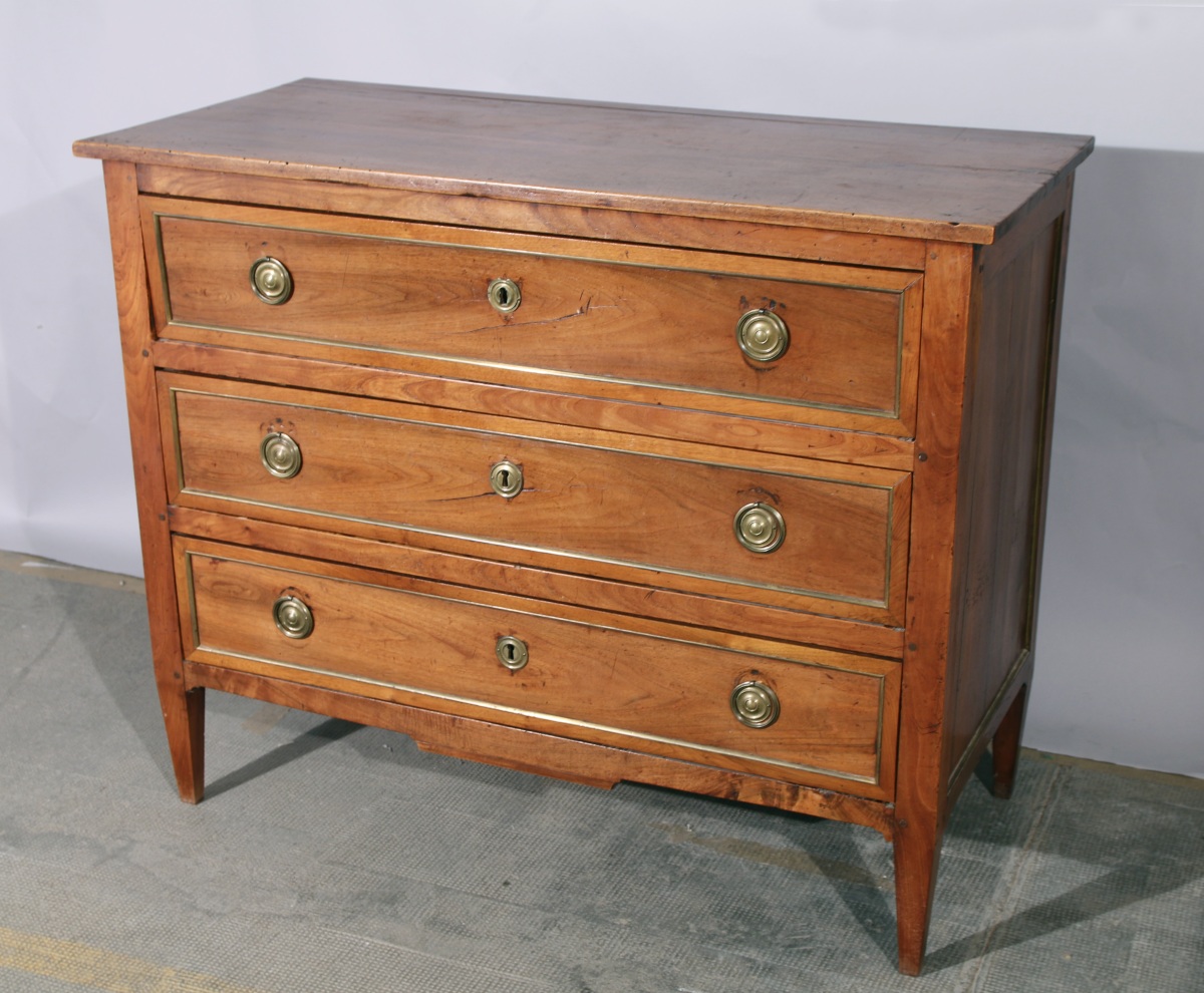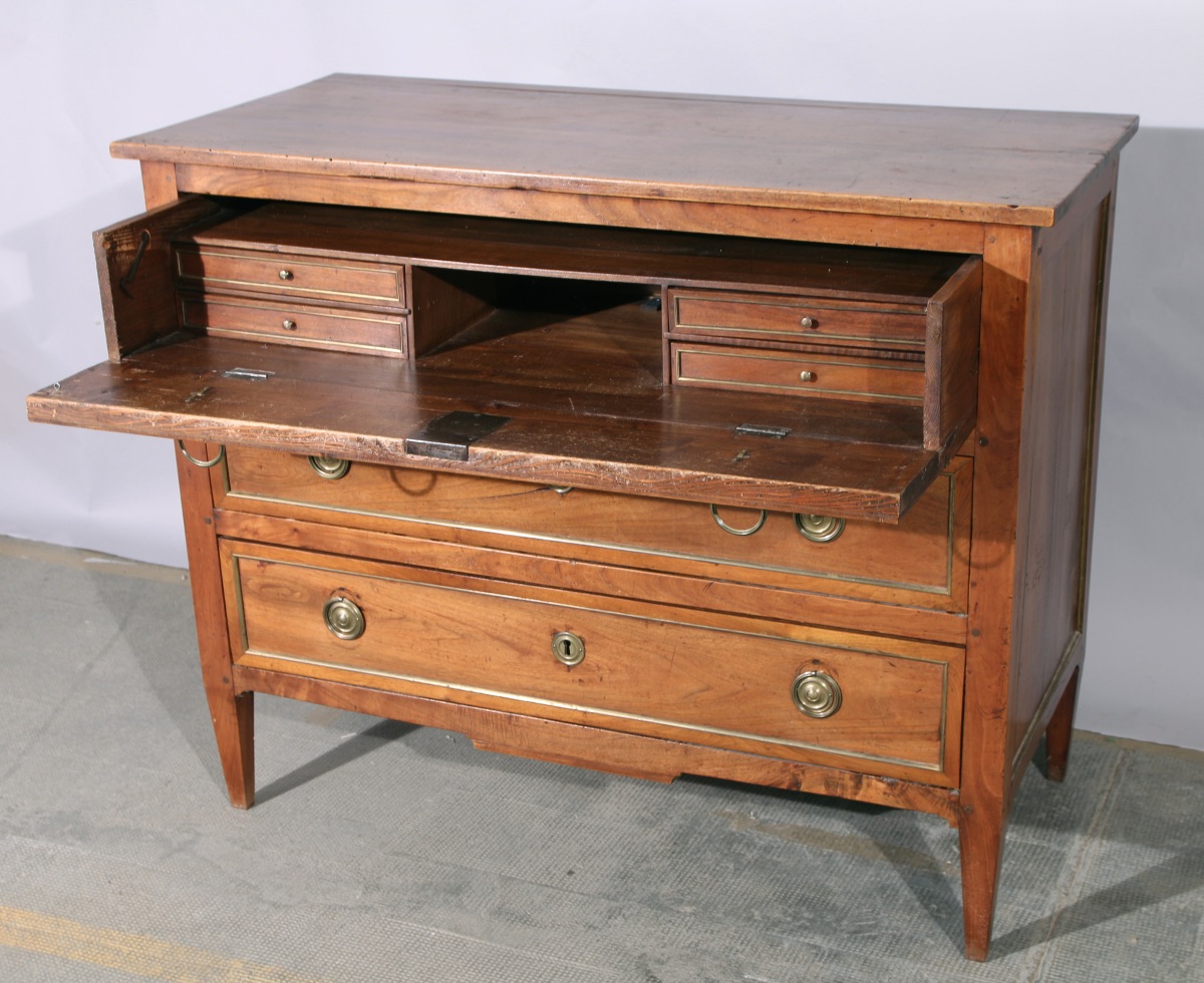 ouvrant en façade par deux tiroirs. Un tiroir simulé en partie supérieure se rabat pour découvrir un pupitre agrémenté de quatre tiroirs et une niche. Ornementation de filets de laiton. Anneaux de tirage et entrées de serrures en bronze rapportés. Elle repose sur quatre pieds gaine.