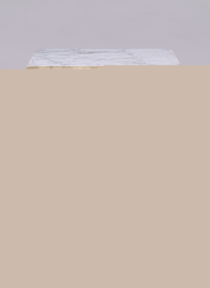 marqueté en losanges. Il ouvre en façade par trois tiroirs. Garniture de bronzes dorés tels que chutes, entrées de serrures et sabots à décor d'acanthe, carquois et flambeaux. Ceinture chantournée. Dessus de marbre blanc.