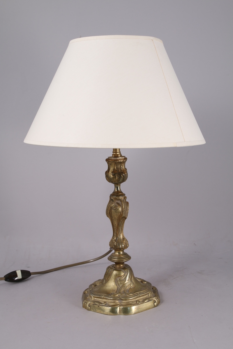 monté en LAMPE, de forme rocaille, aux contours chantournés et motifs sculptés de coquilles et rinceaux végétaux. Le flambeau est en trois parties vissées, le fût en balustre torsadée. L'ensemble est monté en lampe et électrifié, doté d'un abat-jour moderne couleur ivoire.