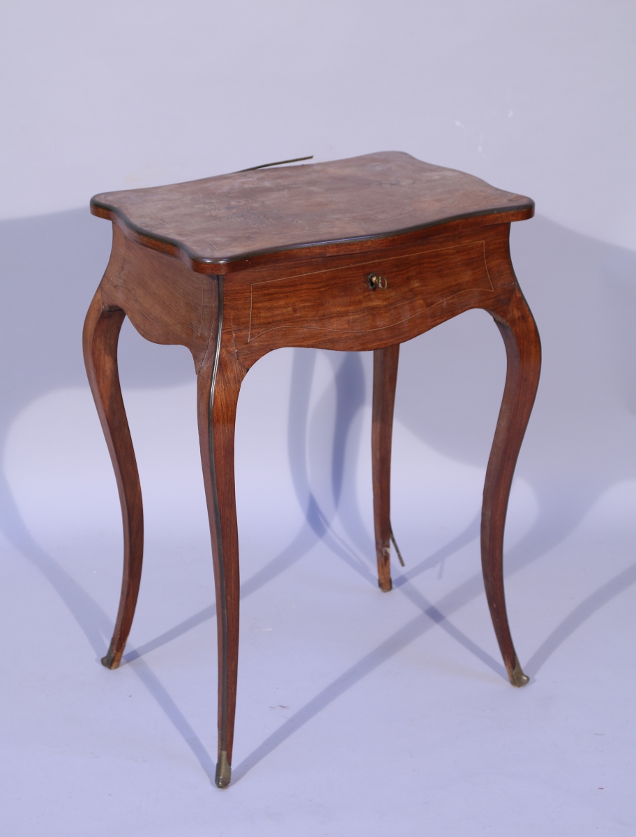 le plateau ouvrant par un abatant sur un intérieur compartimenté. Décor marqueté d'un bouquet de fleurs et d'un passereau portant un rameau dans son bec agrémenté de filets de laiton. Elle repose sur quatre pieds cambrés à sabots de bronze.