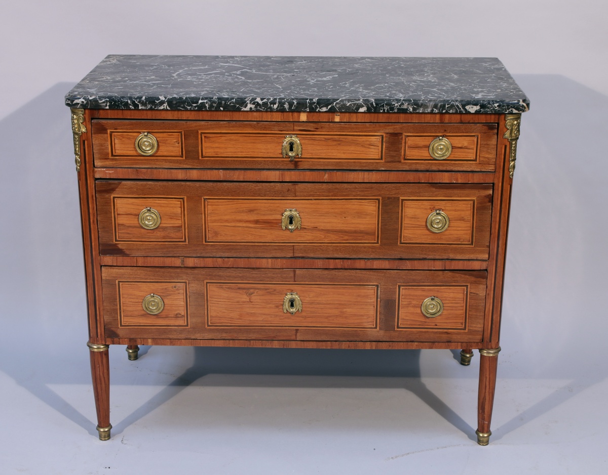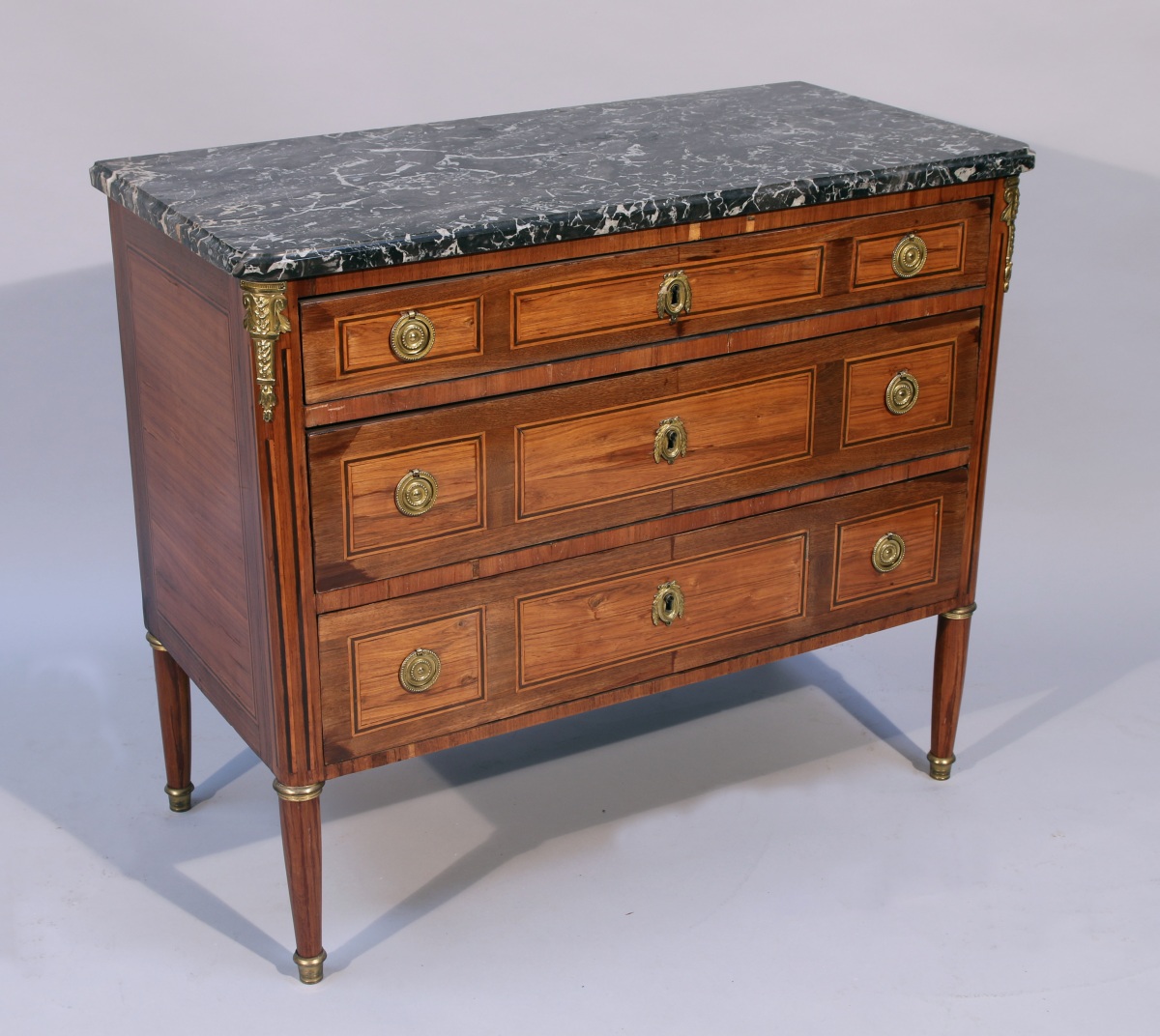 de forme rectangulaire ouvrant par trois tiroirs en façade. Les montants arrondis ornés de cannelures simulées. Garniture de bronzes ciselés et dorés tels que chutes, entrées de serrure en médaillon rubané et anneaux mobiles. Dessus de marbre gris Sainte-Anne.
