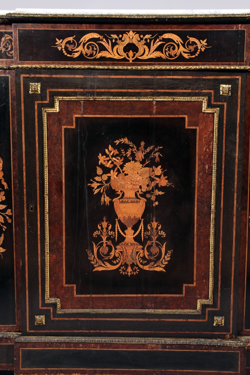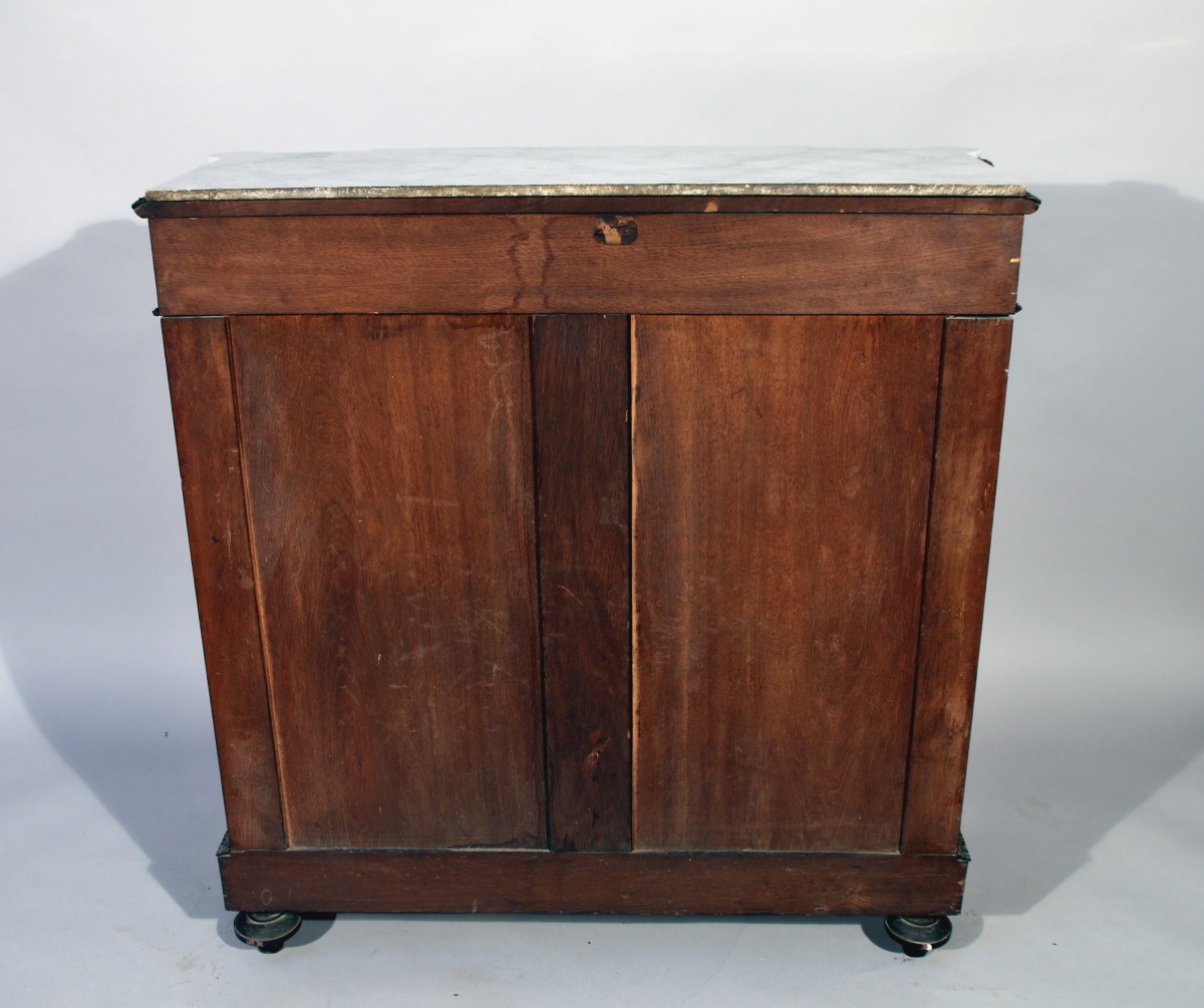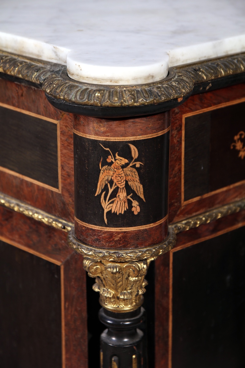 loupe et filets de bois clair ouvrant en façade par un vantail en ressaut. Ce dernier orné d'une riche marqueterie figurant un vase fleuri, flanqué de bouquets de fleurs rubanés. Montants à colonnes en balustres superposées détachées, cannelées et rudentées. Ornementation de bronzes ciselés et dorés tels que frises, chapiteaux, asperges, écoinçons fleuronnés et bagues. Le plateau est foncé d'un marbre blanc. Le meuble repose sur quatre pieds toupies.