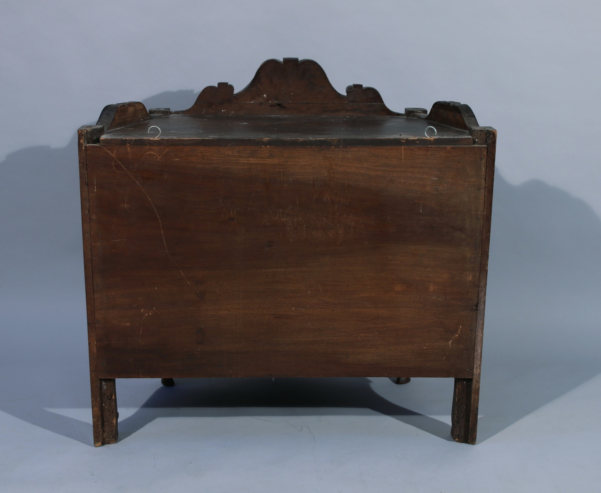 - PÉTRIN à quatre parois inclinées en noyer mouluré et sculpté d'un panier fleuri et de semis de fleurs dans des cartouches chantournés. Il est fermé par un plateau à la découpe mouvementée. Le pétrin repose sur un piètement quadripode également orné en ceinture et sur la traverse inférieure d'un décor sculpté d'épis de blé, d'instruments de musique et de fleurs. Les quatre pieds de section ronde reliés par des traverses chantournées se terminent en enroulements. Haut. 87, Larg. 104, Prof. 48 cm.