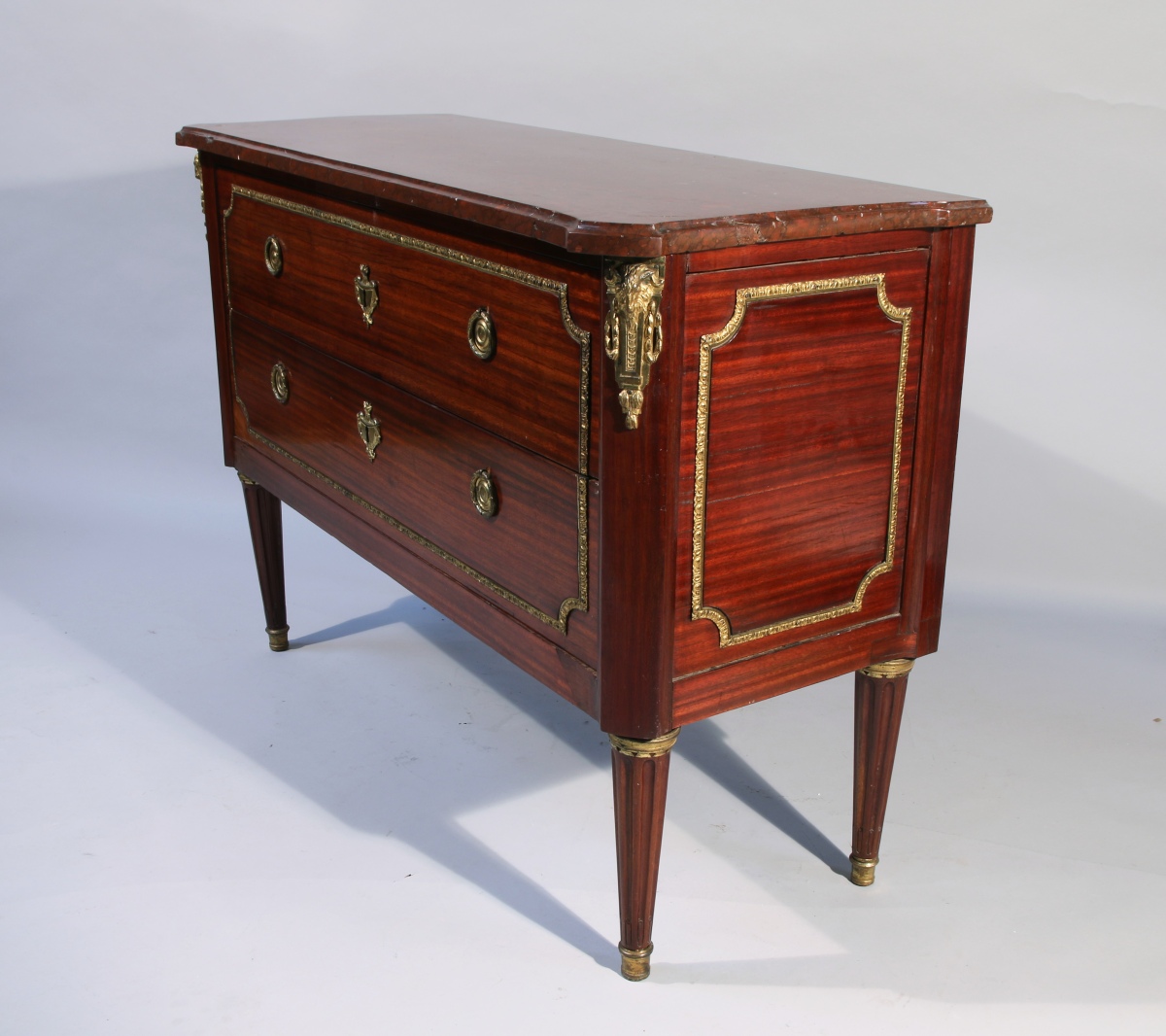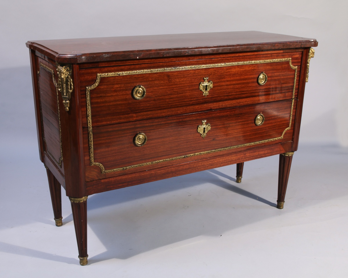 et placage d'acajou ouvrant par deux tiroirs sans traverse. Les montants antérieurs saillants et les quatre pieds de section ronde, fuselés, cannelés et rudentés. Garniture en bronzes ciselés et dorés de style néoclassique tels que frise de fleurs de lotus encadrant la façade et les côtés, poignées de tirage mobiles en tores de laurier, entrées de serrure feuillagées, chute d'angles aux têtes de lions, chapiteaux et sabots.