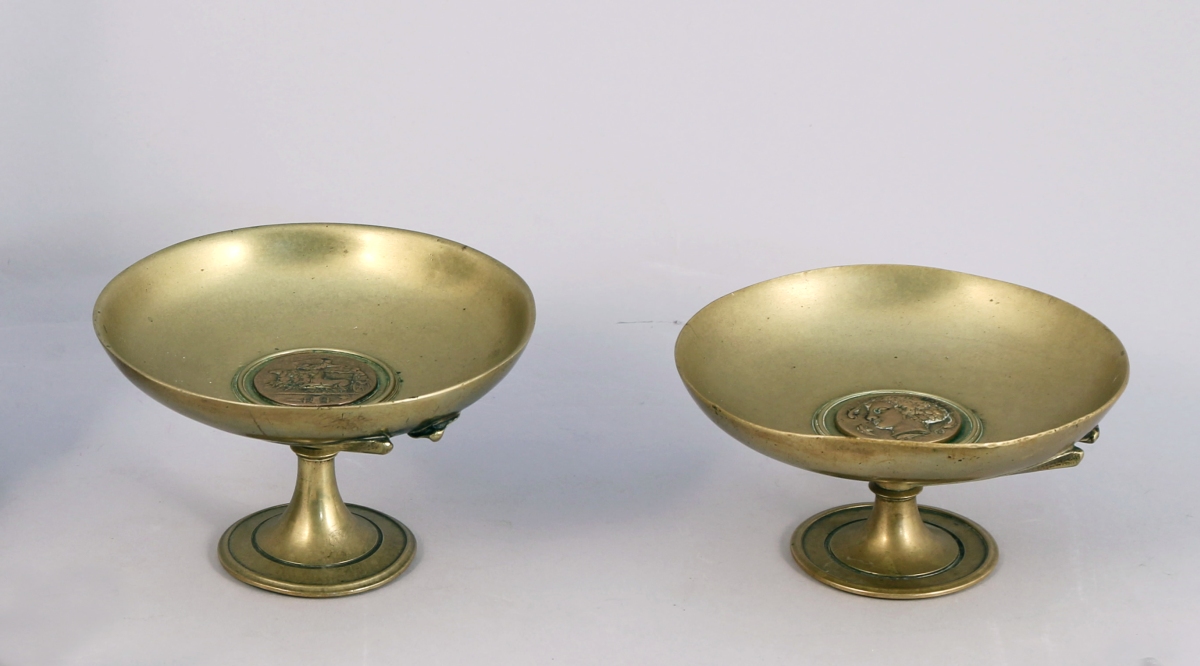 Paire de COUPES en bronze aux monnaies antiques, a panse décorée de quatre feuilles de laurier en relief. Reproductions décadrachmes en bronze à patine médaille dorée encastrées au centre. L'une des monnaies à la tête de la nymphe d'Aréthuse tournée vers la gauche, encadrée de quatre dauphins, à l'inscription "SYRAKOSION". L'autre monnaie au quadrige au galop couronné d'une victoire, surmonté un casque attique, un bouclier, des cnémides, une cuirasse et une lance.