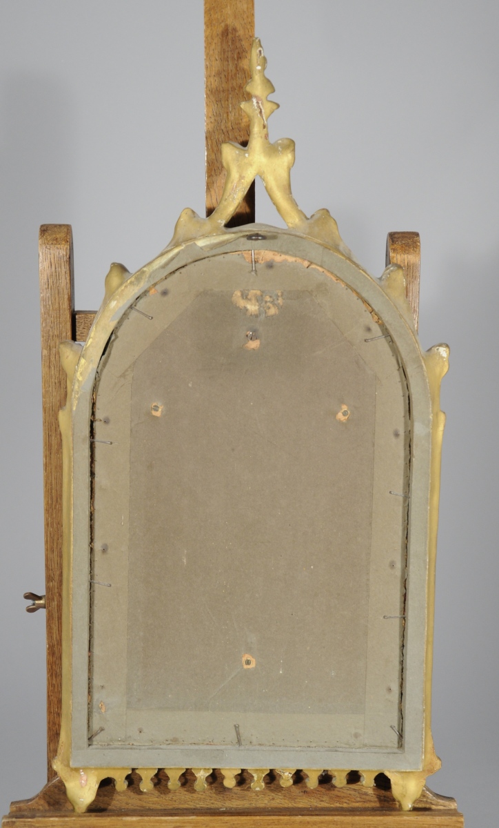 CHRIST en Croix en ivoire (elephantidae SPP) sculpté. Croix en bois doré. Il s'inscrit dans un riche cadre en bois sculpté, stuqué et doré adoptant la forme d'une baie gothique sommée d'un pinacle.