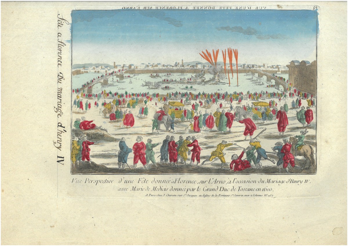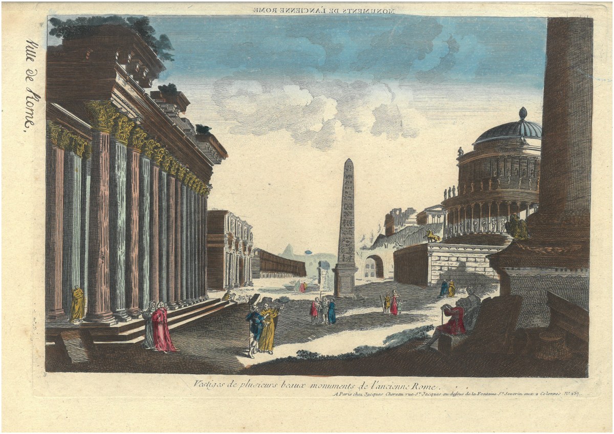 Les vues d'optiques témoignent d'une vogue des images en perspective, montrées dans les salons dès la fin du XVIIIe siècle et au début du XIXe siècle. Ce lot présente des ves de Florence, Venise et Rome, dont une vue des anciens monuments de Rome, témoignant du goût de ce siècle pour l'Antiquité.