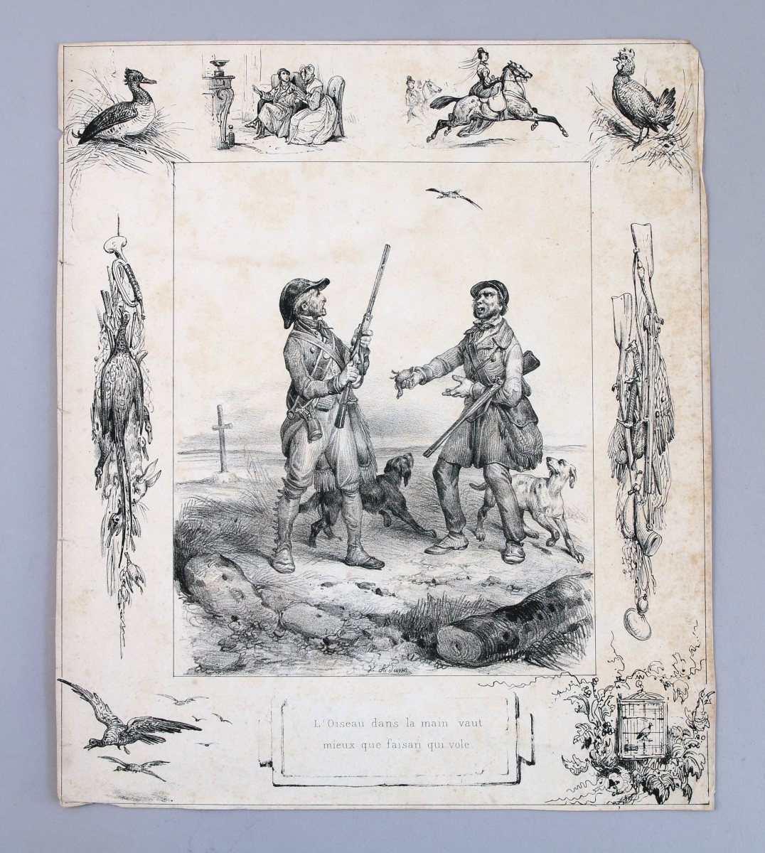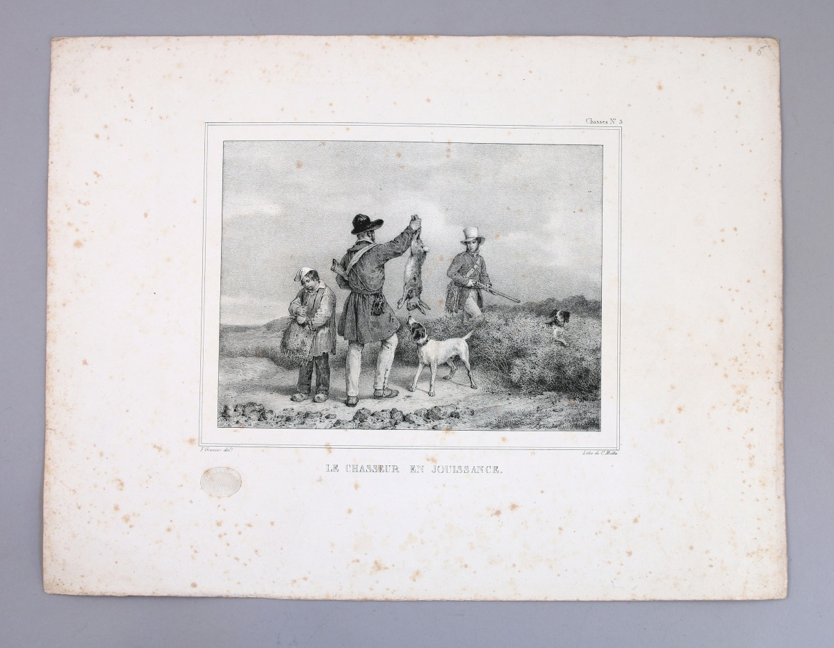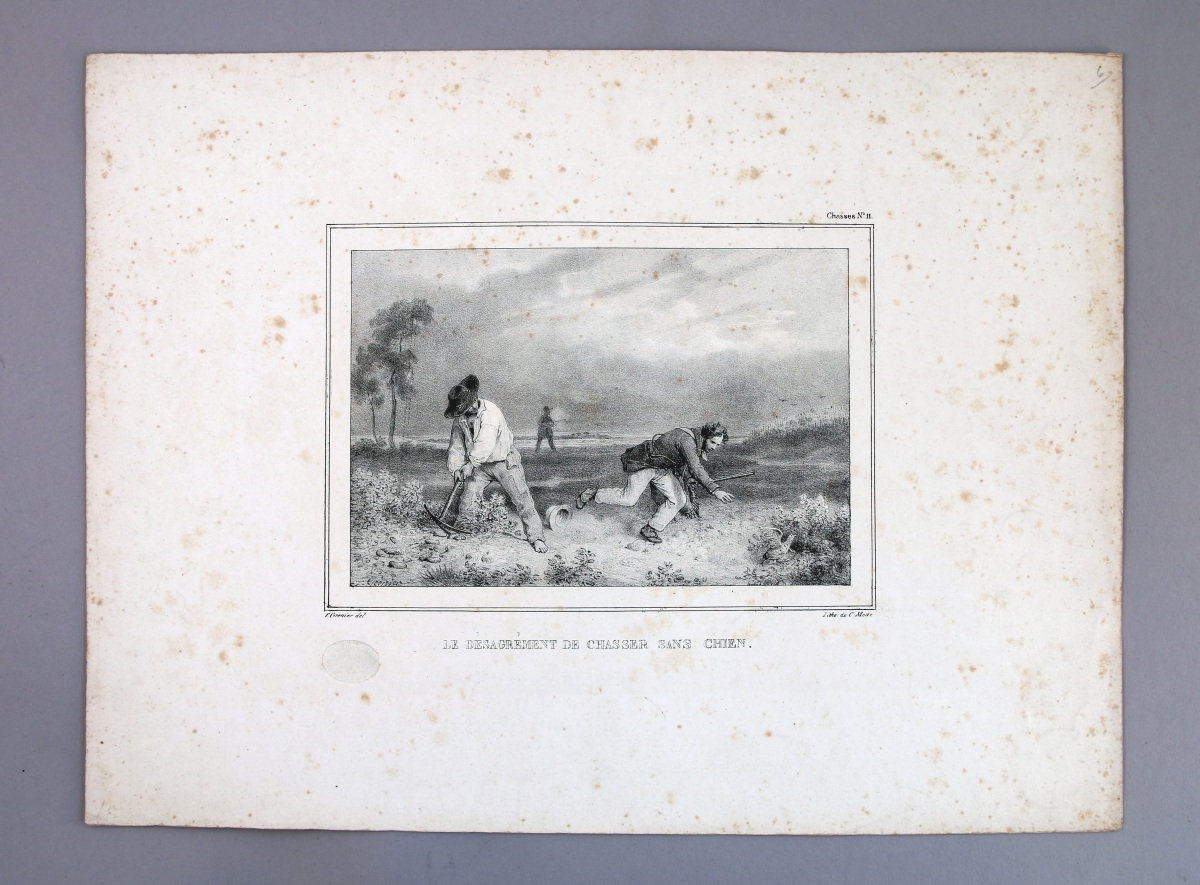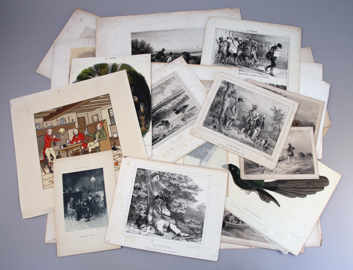 CHASSE. Réunion de 35 MULTIPLES dont : Harry Eliott; "Le Chasseur en Jouissance"; "Physiologie du Chasseur Parisien"; "L'oiseau dans la main vaut mieux que faisan qui vole"; "Le désagrément de chasser sans chien"; etc.
