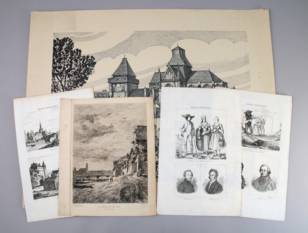 Réunion de 12 MULTIPLES dont : Retour de chasse au château de Brissac; Ancienne vue d'Angers; Ancienne vue d'Angers "Mors Sceptra Ligonibus Aequat"; Vues de Laval; Costumes de Mayenne; etc.